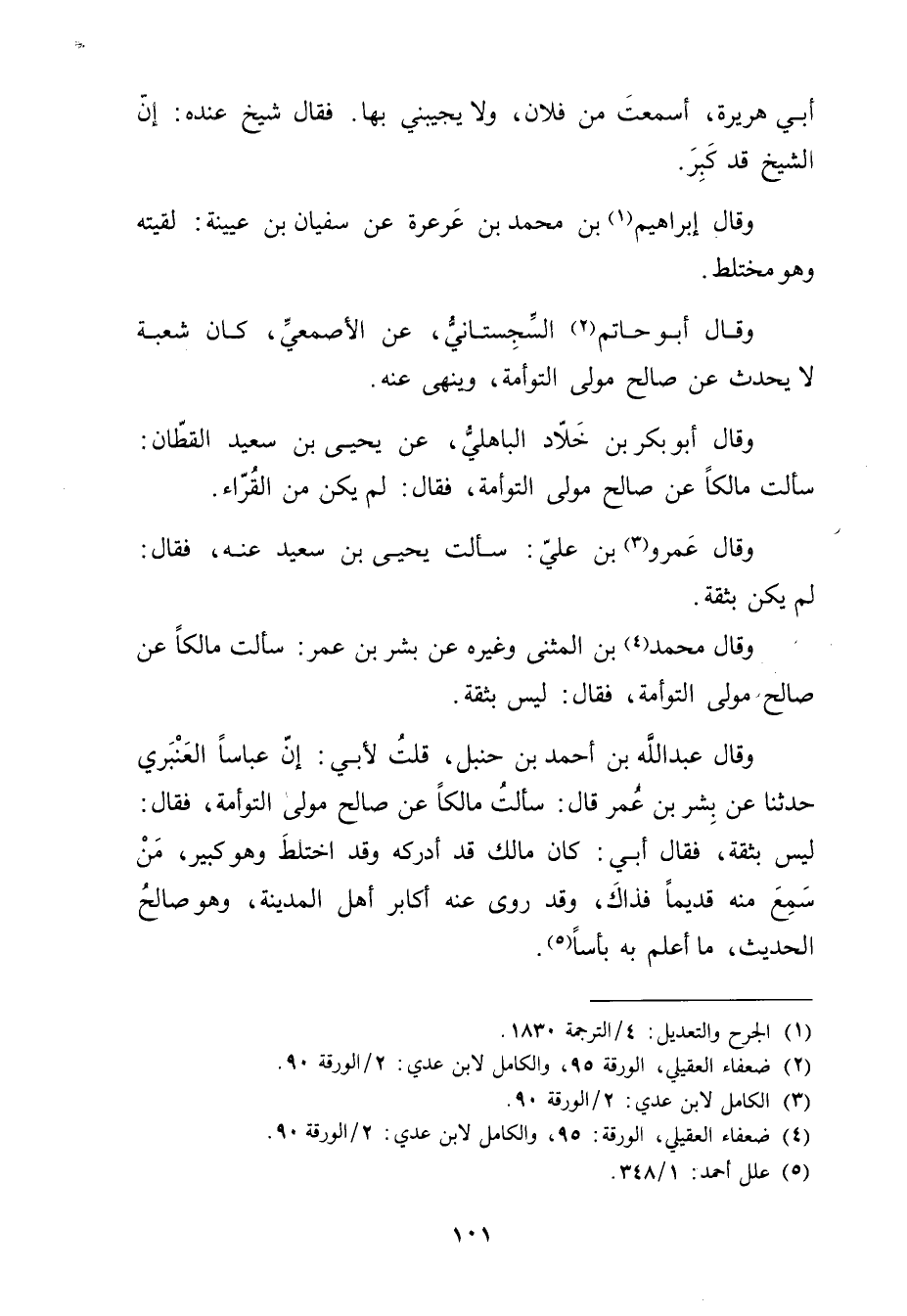 وَقَال عَبد اللَّهِ بْن أَحْمَد بْن حنبل، قلتُ لأبي: إن عباسا العنبري حَدَّثَنَا عن بشر بن عُمَر قال: سألت مالكا عن صالح مولى التوأمة، فقال: ليس بثقة، فقال أبي: كان مالك قد أدركه وقد اختلط وهو كبير، من سمع منه قديما فذاك، وقد روى عنه أكابر أهل المدينة، وهو صالح الحديث، ما أعلم به بأسًا (5) .