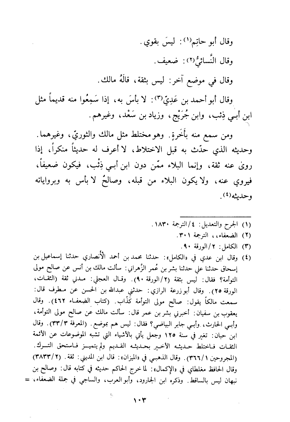 (4) وَقَال ابن عدي في "الكامل": حَدَّثَنَا محمد بن أحمد الأَنْصارِيّ حَدَّثَنَا إسماعيل بن إسحاق حَدَّثَنَا علي حَدَّثَنَا بِشْرُ بْنُ عُمَر الزَّهْرَانِيُّ: سألت مَالِك بْن أنس عَنْ صالح مولى التوأمة؟ فقال: ليس بثقة (2 / الورقة 90) . وَقَال العجلي: مدني ثقة (الثقات، الورقة 25) . وَقَال أبو زُرْعَة الرازي: حدثني عَبد اللَّهِ بْنِ الْحَسَنِ عَنْ مطرف قال: سمعت مالكا يقول: صالح مولى التوأمة كذاب. (كتاب الضعفاء 462) . وَقَال يعقوب بن سفيان: أخبرني بشر بن عُمَر قال: سألت مالك عن صالح مولى التوأمة، وأبي الحارث، وأبي جابر البياضي؟ فقال: ليس هم بموضع. (المعرفة 3 / 33) . وَقَال ابن حبان: تغير في سنة 125 وجعل يأتي بالاشياء التي تشبه الموضوعات عن الأئمة الثقات فاختلط حديثه الاخير بحديثه القديم ولم يتميز فاستحق الترك. (المجروحين 1 / 366) . وَقَال الذهبي في "الميزان": قال ابن المديني: ثقة. (2 / 3833) وَقَال الحافظ مغلطاي في "الاكمال": لما خرج الحاكم حديثه في كتابه قال: وصالح بن نبهان ليس بالساقط.