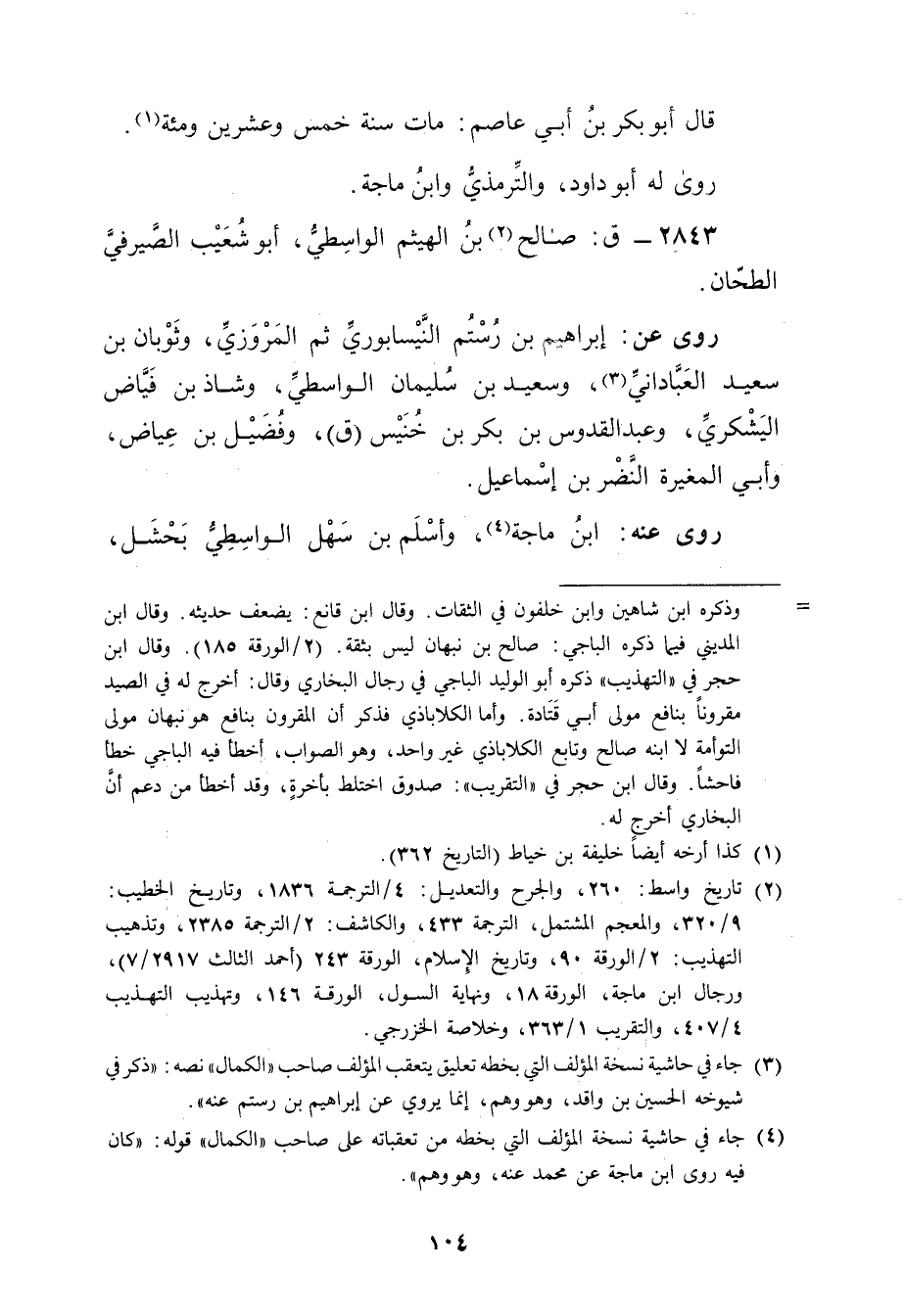 (3) جاء في حاشية نسخة المؤلف التي بخطه تعليق يتعقب المؤلف صالح "الكمال" نصه: ذكر في شيوخه الحسين بن واقد، وهو وهم، إنا يروي عن إبراهيم بن رستم عنه.