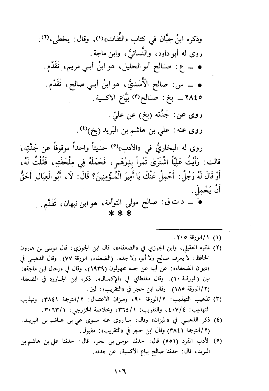 (5) الادب المفرد (551) قال: حَدَّثَنَا موسى بن بحر، قال: حَدَّثَنَا علي بن هاشم بن البريد، قال: حَدَّثَنَا صالح بياع الاكسية، عن جدته.