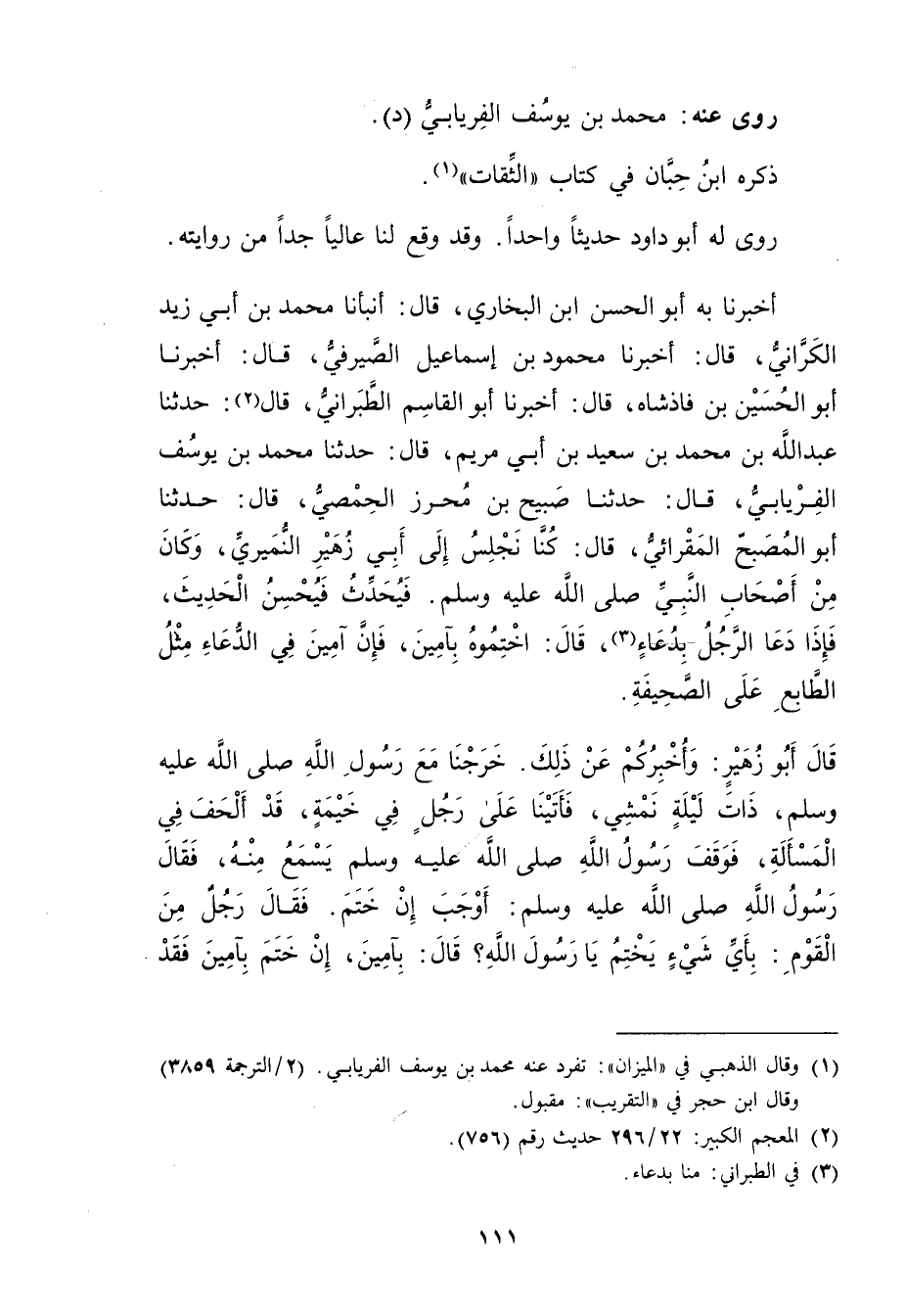 أخبرنا به أَبُو الْحَسَنِ بْنُ الْبُخَارِيِّ، قال: أَنْبَأَنَا مُحَمَّدُ بْنُ أَبي زَيْدٍ الْكَرَّانِيُّ، قال: أَخْبَرَنَا مَحْمُودُ بْنُ إِسْمَاعِيلَ الصَّيْرَفِيُّ، قال: أخبرنا أَبُو الحسين بْن فَاذْشْاهِ، قال: أخبرنا أَبُو الْقَاسِمِ الطَّبَرَانِيُّ، قال (2) : حَدَّثَنَا عَبد اللَّهِ بْن مُحَمَّد بْن سَعِيد بْن أَبي مَرْيَمَ، قال: حَدَّثَنَا مُحَمَّدُ بْنُ يُوسُفَ الْفِرْيَابِيُّ، قال: حَدَّثَنَا صَبِيحُ بْنُ مُحْرِزٍ الْحِمْصِيُّ، قال: حَدَّثَنَا أَبُو الْمُصْبِحِ الْمَقْرَائِيُّ، قال: كُنَّا نَجْلِسُ إِلَى أَبِي زُهَيْرٍ النُّمَيْرِيُّ، وكَانَ مِنْ أَصْحَابِ النَّبِيِّ صَلَّى اللَّهُ عَلَيْهِ وسَلَّمَ. فَيُحَدِّثُ فَيُحْسِنُ الْحَدِيثَ، فَإِذَا دَعَا الرَّجُلُ بِدُعَاءٍ (3) ، قال: اخْتِمُوهُ بِآمِينَ، فَإِنَّ آمِينَ فِي الدُّعَاءِ مِثْلُ الطَّابِعِ عَلَى الصَّحِيفَةِ.