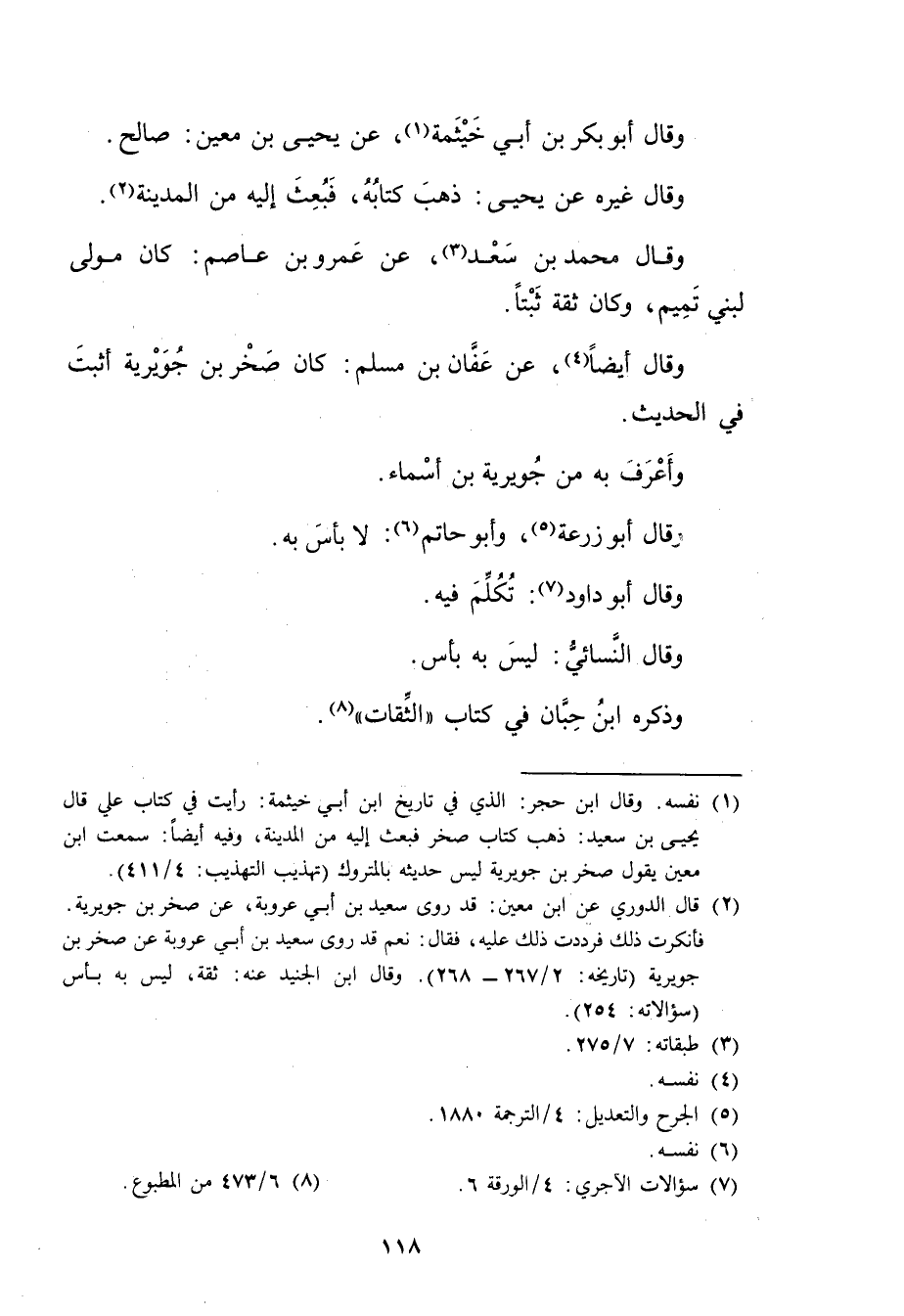 (1) نفسه. وَقَال ابن حجر: الذي في تاريخ ابن أَبي خيثمة: رأيت فِي كتاب علي قال يحيى بْن سَعِيد: ذهب كتاب صخر فبعث إليه من المدينة، وفيه أيضا: سمعت ابن مَعِين يقول صخر بن جويرية ليس حديثه بالمتروك (تهذيب التهذيب: 4 / 411) .