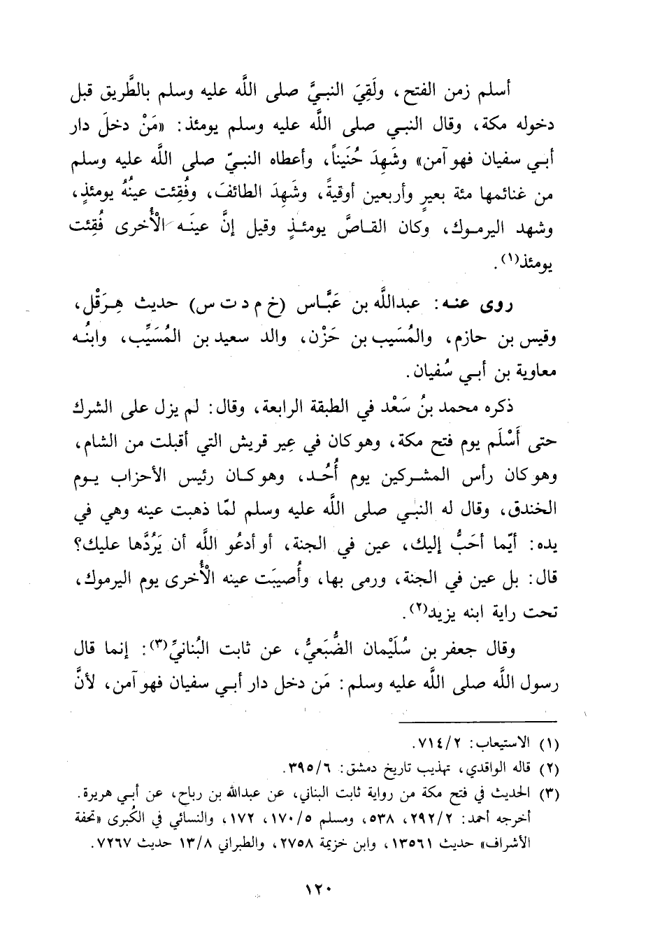 ذكره محمد بن سعد فِي الطبقة الرابعة، وَقَال: لم يزل على الشرك حتى أسلم يوم فتح مكة، وهو كان في عير قريش التي أقبلت من الشام، وهو كان رأس المشركين يوم أحد، وهو كان رئيس الأحزاب يوم الخندق، وَقَال له النبي صَلَّى اللَّهُ عَلَيْهِ وسَلَّمَ لما ذهبت عينه وهي في يده: أيما أحب إليك، عين في الجنة، أو أدعو الله أن يردها عليك؟ قال: بل عين في الجنة، ورمى بها، وأصيبت عينه الأخرى يوم اليرموك، تحت راية ابنه يزيد (2) .