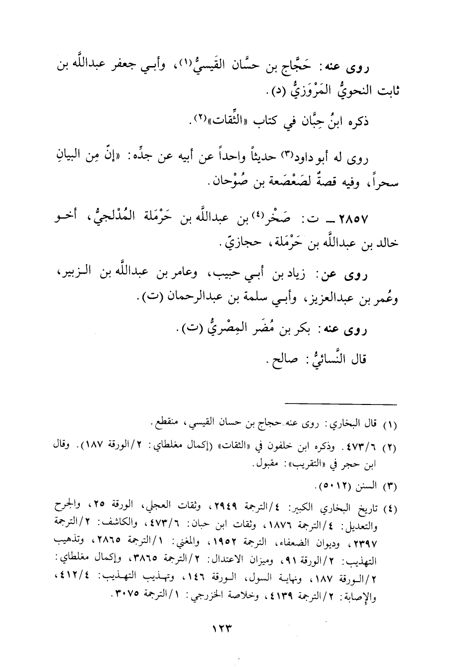 2857 - ت: صخر بْن عَبد اللَّهِ بْن حرملة المدلجي (4) ، أخو خالد بن عَبد اللَّهِ بْن حرملة، حجازي.