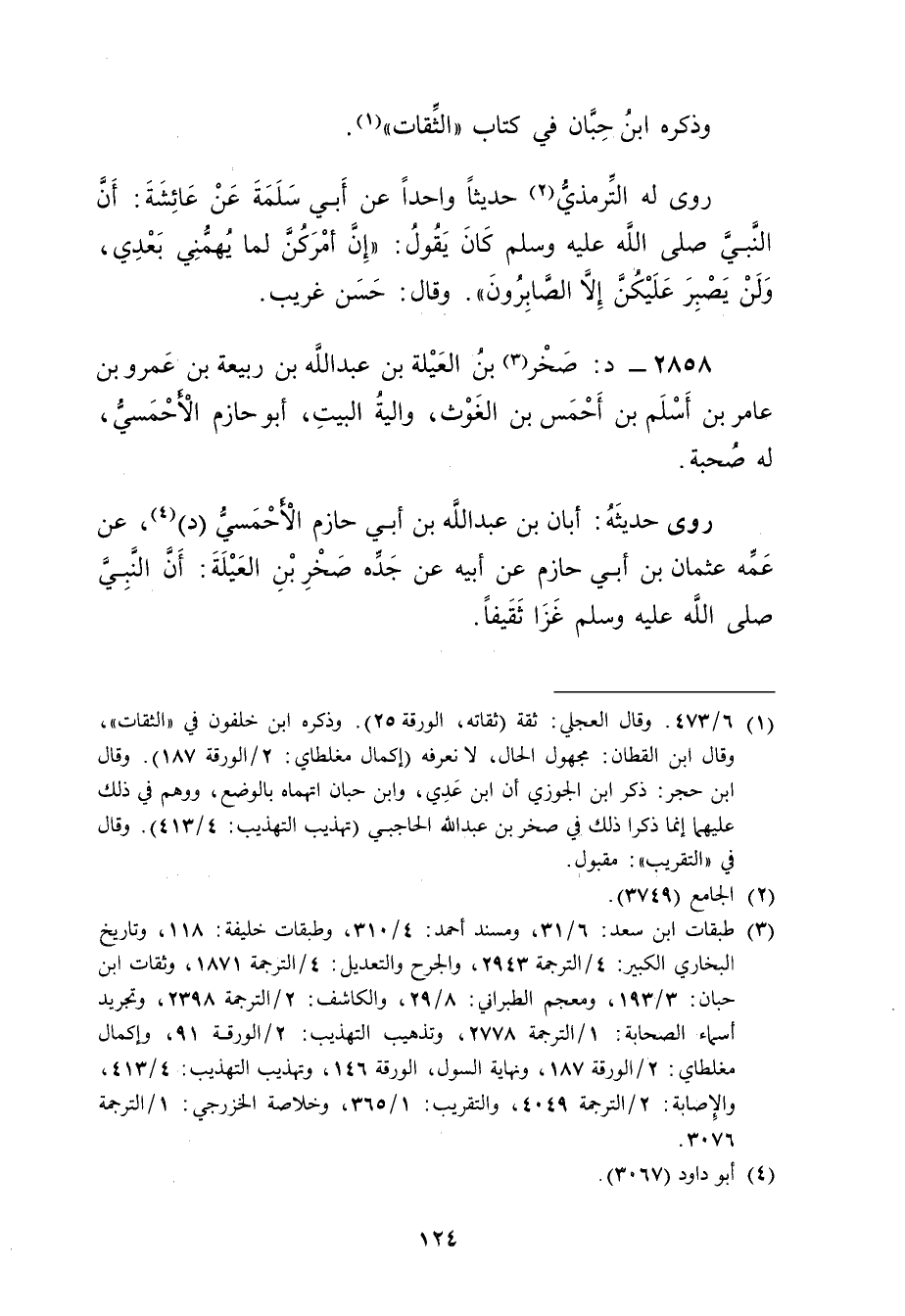 (3) طبقات ابن سعد: 6 / 31، ومسند أحمد: 4 / 310، وطبقات خليفة: 118، وتاريخ البخاري الكبير: 4 / الترجمة 2943، والجرح والتعديل: 4 / الترجمة 1871، وثقات ابن حبان: 3 / 193، ومعجم الطبراني: 8 / 29، والكاشف: 2 / الترجمة 2398، وتجريد أسماء الصحابة: 1 / الترجمة 2778، وتذهيب التهذيب: 2 / الورقة 91، وإكمال مغلطاي: 2 / الورقة 187، ونهاية السول، الورقة 146، وتهذيب التهذيب: 4 / 413، والاصابة: 2 / الترجمة 4049، والتقريب: 1 / 365، وخلاصة الخزرجي: 1 / الترجمة 3076.