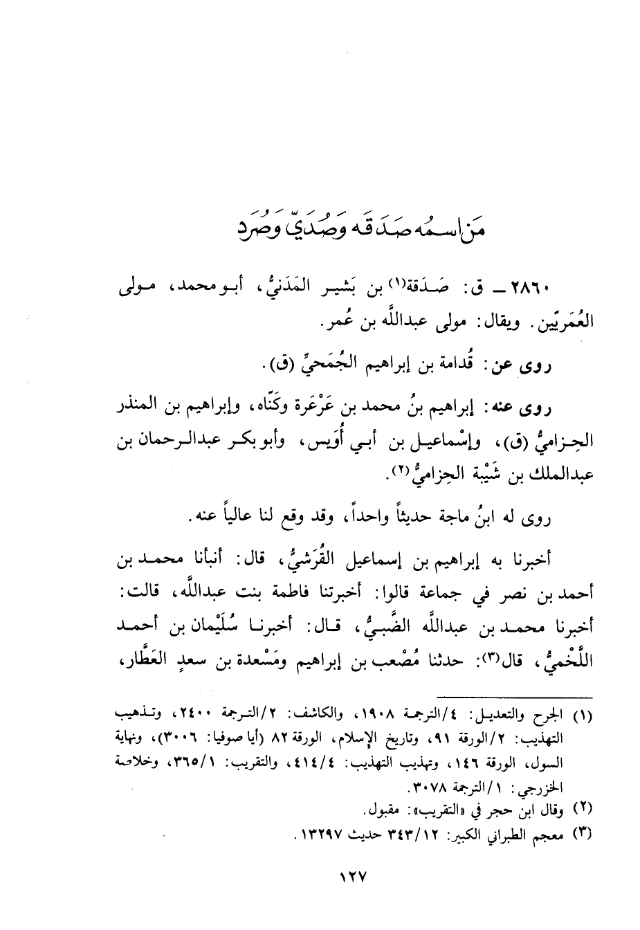 2860 - ق: صدقة بن بشير المدني (1) ، أبو محمد، مولى العُمَريين.