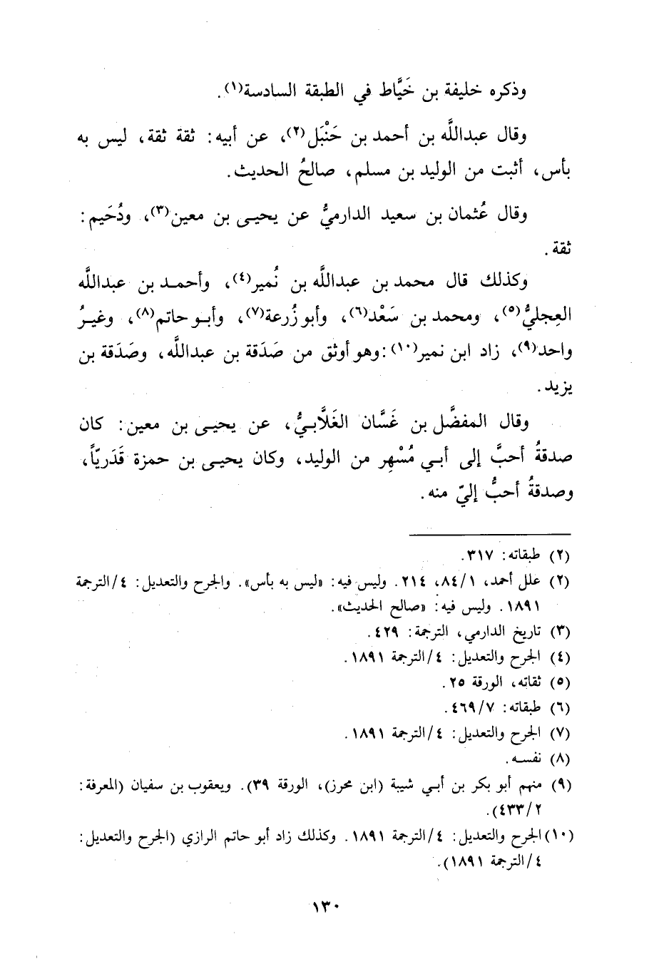 وكذلك قال مُحَمَّد بْن عَبد اللَّهِ بْن نمير (4) ، وأَحْمَد بْن عَبد اللَّهِ العجلي (5) ، ومحمد بْن سعد (6) ، وأبو زُرْعَة (7) ، وأبو حاتم (8) ، وغير واحد (9) ، زاد ابن نمير (10) : وهو أوثق من صدقة بْن عَبد اللَّه، وصدقة بْن يزيد.
