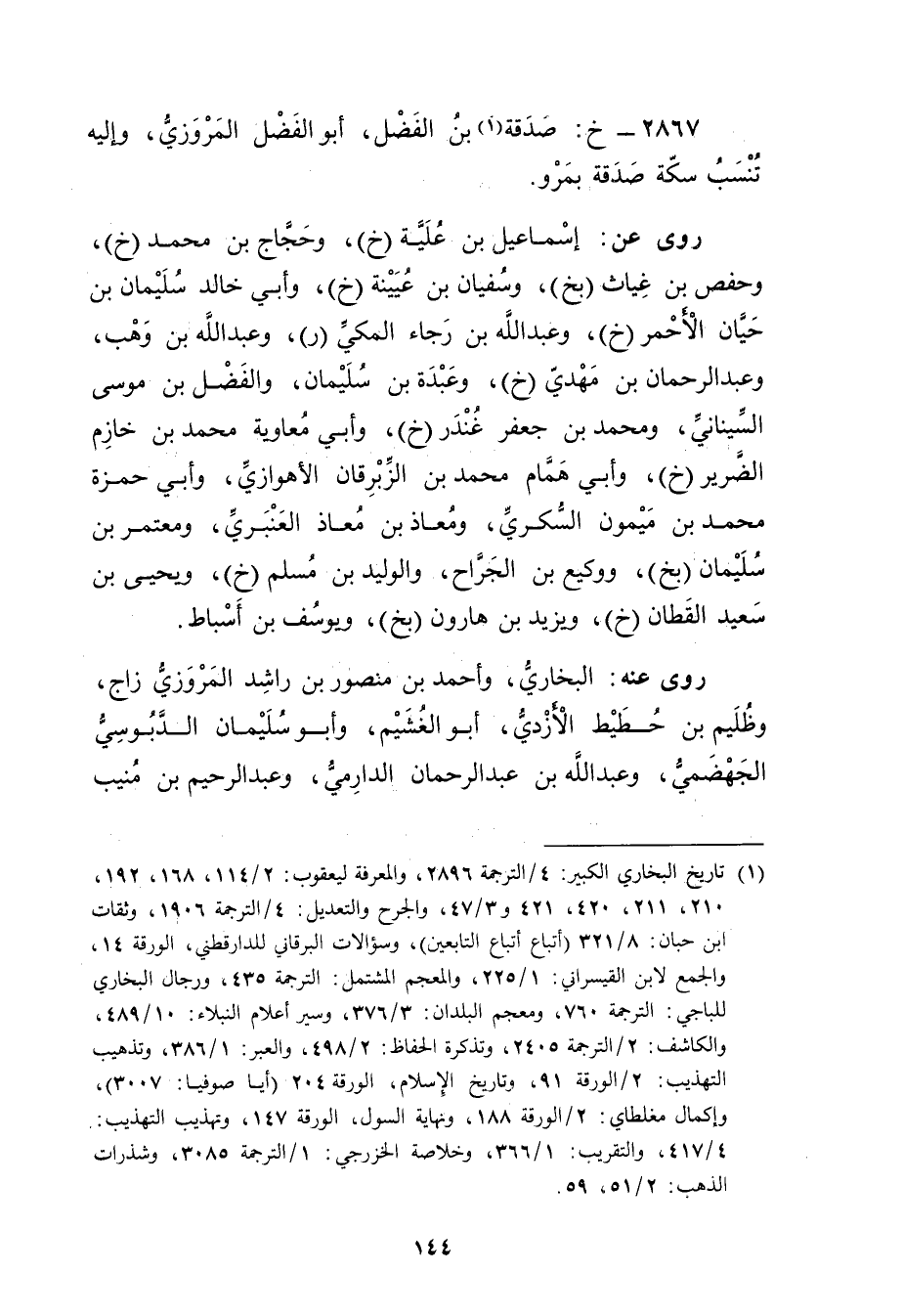 2867 - خ: صدقة بن الفضل (1) ، أبو الفضل المروزي، وإليه تنسب سكة صدقة بمرو.
