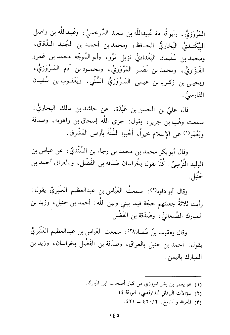 وَقَال أبو بكر مُحَمَّد بْن مُحَمَّد بْن رجاء بن السندي، عن عباس بن الوليد النرسي: كنا نقول بخراسان صدقة بن الفضل، وبالعراق أحمد بن حنبل.