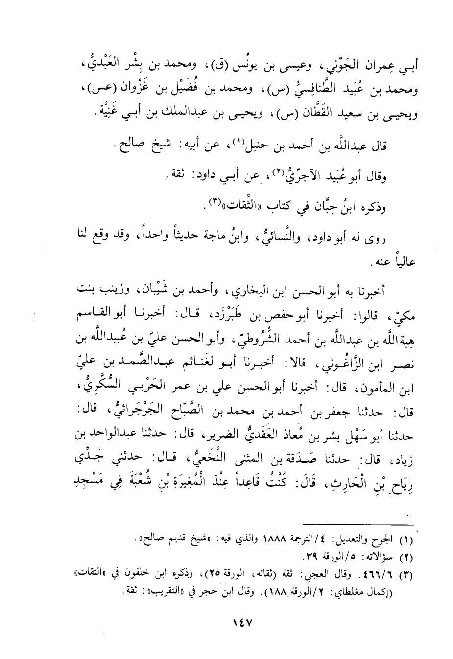 (1) الجرح والتعديل: 4 / الترجمة 1888 والذي فيه: شيخ قديم صالح.