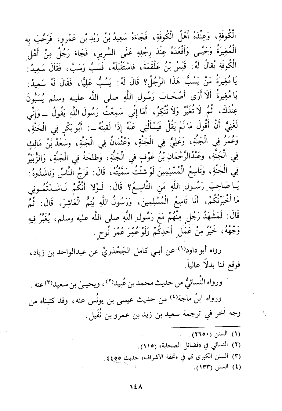 الْكُوفَةِ، وعِنْدَهُ أَهْلُ الْكُوفَةِ، فَجَاءَهُ سَعِيد بْن زيد بْن عَمْرو، فَرَحَّبَ بِهِ الْمُغِيرَةُ وحَيَّى وأَقْعَدَهُ عِنْدَ رِجْلِهِ عَلَى السِّرِيرِ، فَجَاءَ رجل من أهل الكوفة يقال لَهُ: قَيْسُ بْنُ عَلْقَمَةَ، فَاسْتَقْبَلَهُ، فَسَبَّ وسَبَّ، فَقَالَ سَعِيد: يَا مُغِيرَةُ مَنْ يَسُبُّ هَذَا الرَّجُلُ؟ قال لَهُ: يَسُبُّ عَلِيًّا، فَقَالَ لَهُ سَعِيد: يَا مُغِيرَةَ أَلا أَرَى أَصْحَابَ رَسُولِ اللَّهِ صَلَّى اللَّهُ عَلَيْهِ وسَلَّمَ يسبون عندك، ثُمَّ لا تُغَيِّرُ ولا تُنْكِرُ، أَمَا إِنِّي سَمِعْتُ رَسُولَ اللَّهِ يَقُولُ - وإِنِّي لَغَنِيٌّ أَنْ أَقُولَ مَا لَمْ يُقَلْ فَيَسْأَلُنِي عَنْهُ إِذَا لَقِيتُهُ: أَبُو بَكْرٍ فِي الْجَنَّةِ، وعُمَر فِي الْجَنَّةِ، وعَلِيٌّ فِي الْجَنَّةِ، وعُثْمَانُ فِي الْجَنَّةِ، وسعد بْن مَالِك فِي الجنة، وعَبْدُ الرَّحْمَنِ بْنُ عَوْفٍ فِي الْجَنَّةِ، وطَلْحَةُ فِي الْجَنَّةِ، والزُّبَيْرُ فِي الْجَنَّةِ، وتَاسِعُ الْمُسْلِمِينَ لَوْ شِئْتَ سَمَّيْتُهُ، قال: فَرَجَّ النَّاسُ ونَاشَدُوهُ: يَا صَاحِبَ رَسُولِ اللَّهِ من التاسع؟ قال: لَوْلا أَنَّكُمْ نَاشَّدْتُمُونِي مَا أَخْبَرْتُكُمْ، أَنَا تَاسِعُ الْمُسْلِمِينَ، ورَسُولُ اللَّهِ يُتِمُّ الْعَاشِرَ، قال: ثُمَّ قال: لَمَشْهَدُ رَجُلٍ مِنْهُمْ مَعَ رَسُولِ اللَّهِ صلى الله عليه وسلم، يُغَبَّرُ فِيهِ وجْهُهُ، خَيْرٌ مِنْ عَمَلِ أَحَدِكُمْ ولَوْ عُمَر عُمَر نُوحٍ.
