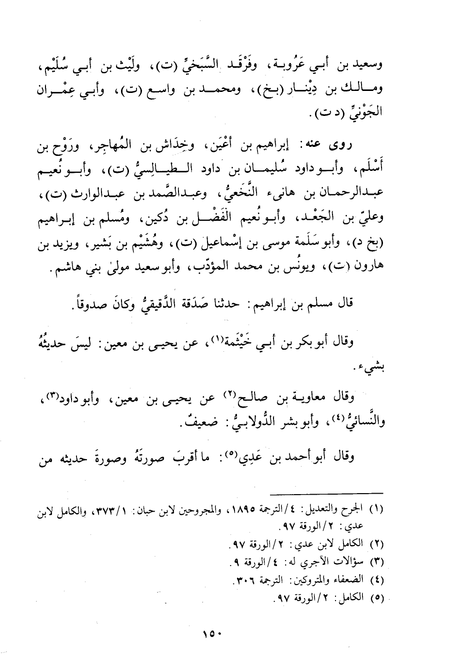 (1) الجرح والتعديل: 4 / الترجمة 1895، والمجروحين لابن حبان: 1 / 373، والكامل لابن عدي: 2 / الورقة 97.