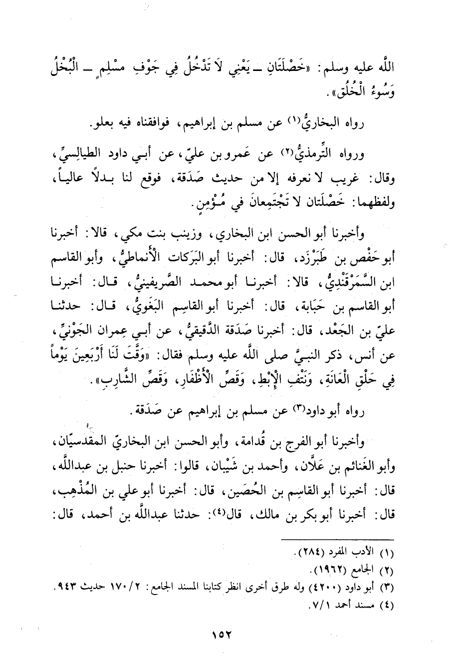 ورواه التِّرْمِذِيّ (2) عَنْ عَمْرو بْن عَلِيٍّ، عَن أَبِي دَاوُدَ الطَّيَالِسِيِّ، وَقَال: غريب لا نعرفه إلا مِنْ حَدِيثِ صَدَقَةَ، فَوَقَعَ لَنَا بَدَلا عَالِيًا، ولَفْظُهُمَا: خَصْلَتَانِ لا تَجْتَمِعَانِ فِي مُؤْمِنٍ.