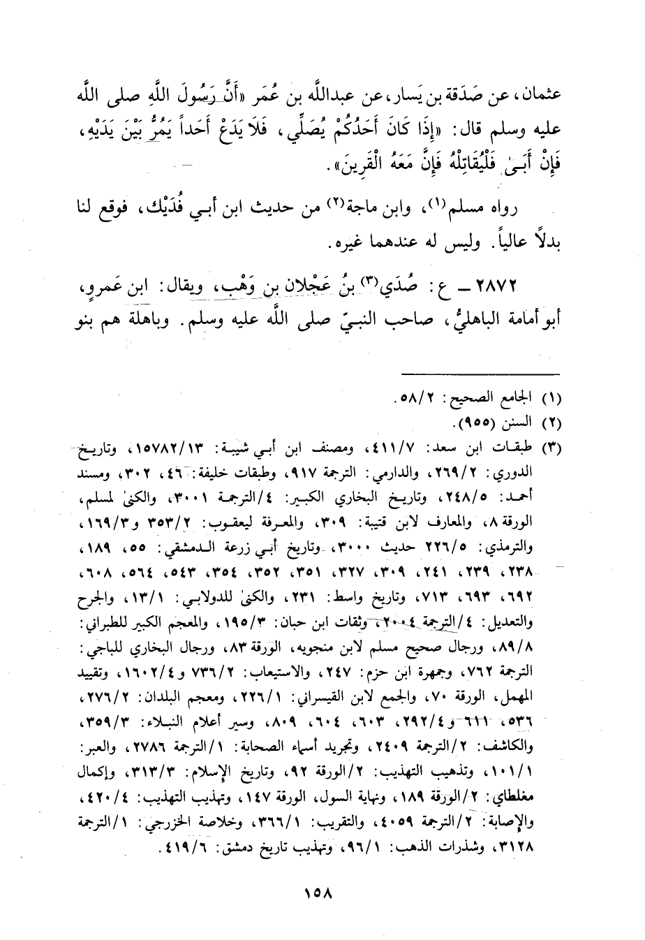 عُثْمَانَ، عَنْ صَدَقَةَ بْنِ يَسَارٍ، عن عَبد الله بْن عُمَر"أن رَسُول اللَّهِ صَلَّى اللَّهُ عَلَيْهِ وسَلَّمَ قال: إِذَا كَانَ أَحَدُكُمْ يُصَلِّي، فَلا يَدَعْ أَحَدًا يَمُرُّ بَيْنَ يَدَيْهِ، فَإِنَّ أَبَى فَلْيُقَاتِلْهُ فَإِنَّ مَعَهُ الْقَرِينُ.