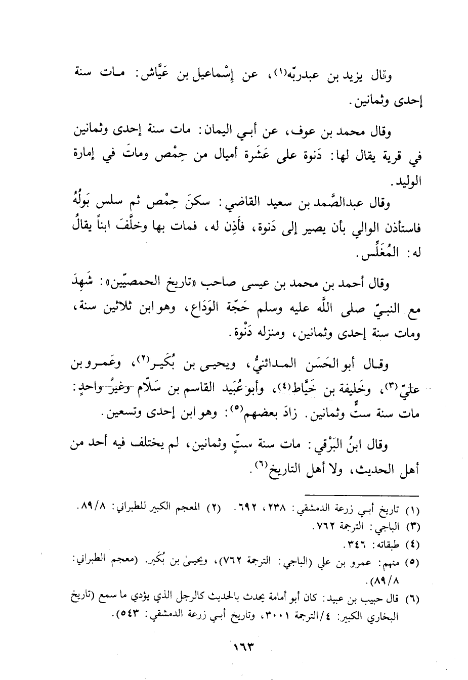 وَقَال أبو الحسن المدائني، ويحيى بن بكير (2) ، وعَمْرو بْن عَلِيٍّ (3) ، وخليفة بْن خياط (4) ، وأبو عُبَيد القاسم بْن سلام وغير واحد: مات سنة ست وثمانين. زاد بعضهم (5) : وهو ابن إحدى وتسعين.