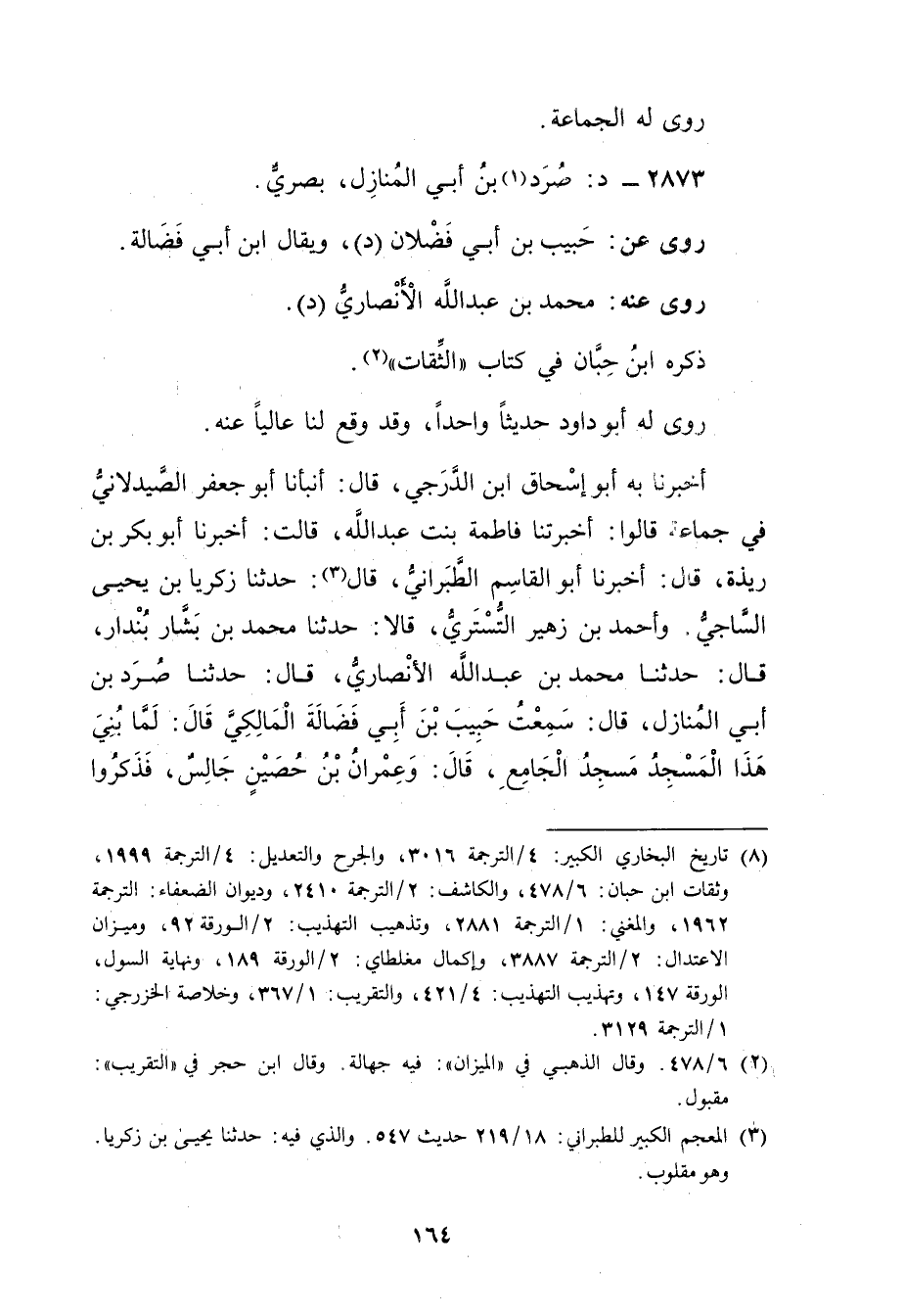 وأَحْمَدُ بْنُ زُهَيْرٍ التُّسْتَرِيُّ، قَالا: حَدَّثَنَا مُحَمَّدُ بْنُ بَشَّارٍ بُنْدَارٌ، قال: حَدَّثَنَا مُحَمَّدُ بْنُ عَبد اللَّهِ الأَنْصارِيّ، قال: حَدَّثَنَا صُرَدُ بْنُ أَبي الْمُنَازِلِ، قال: سَمِعْتُ حَبِيبَ بْنَ أَبي فُضَالَةَ الْمَالِكِيَّ قال: لَمَّا بُنِيَ هَذَا الْمَسْجِدُ مَسْجِدُ الْجَامِعِ، قال: وعِمْران بن حصين جالس، فذكروا