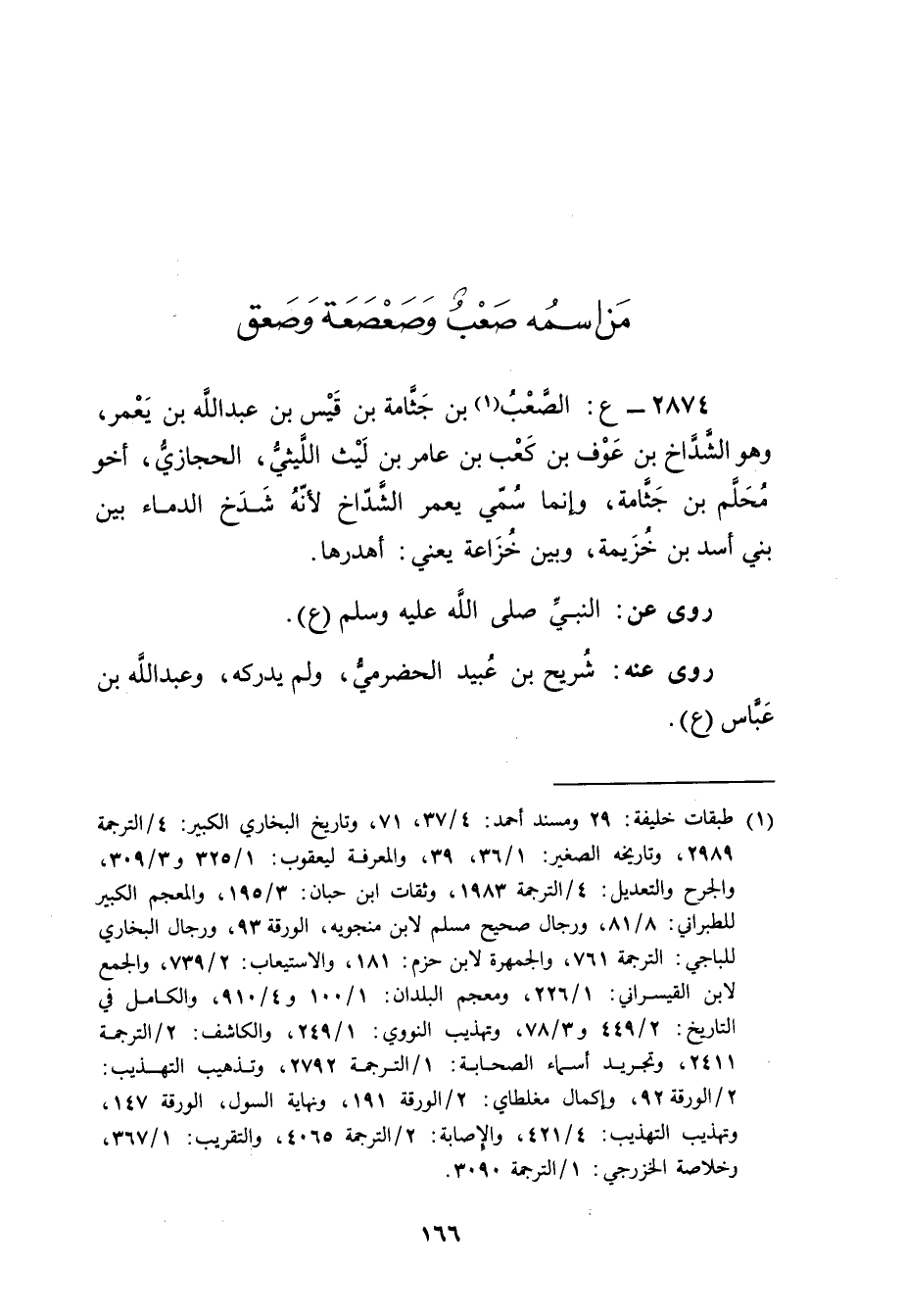 2874 - ع: الصعب بن جثامة بن قيس بن عَبد الله بن يعُمَر (1) ، وهو الشداخ بن عوف بن كعب بن عامر بن ليث الليثي، الحجازي، أخو محلم بن جثامة، وإنما سمي يعُمَر الشداخ لأنه شدخ الدماء بين بني أسد بن خزيمة، وبين خزاعة يعني: أهدرها.