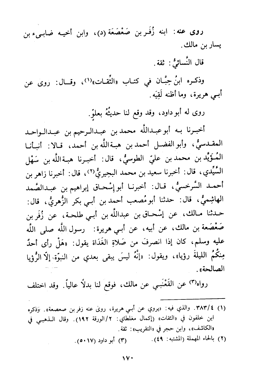 أَخْبَرَنَا بِهِ أَبُو عَبْدِ اللَّهِ مُحَمَّدِ بْنِ عَبد الرَّحِيمِ بْنِ عَبْدِ الْوَاحِدِ الْمَقْدِسِيُّ، وأَبُو الْفَضْلِ أَحْمَد بْن هبة اللَّه بْن أَحْمَدَ، قَالا: أَنْبَأَنَا الْمُؤَيِّدُ بْنُ مُحَمَّدِ بْن عَلِيٍّ الطوسي، قال: أَخْبَرَنَا هِبَة اللَّهِ بْنُ سَهْلٍ السَّيِّدِيَّ، قال: أخبرنا سَعِيد بْنُ مُحَمَّدٍ الْبُحَيْرِيُّ (2) ، قال: أخبرنا زَاهِرُ بن أَحْمَد السرخسي، قال: أَخْبَرَنَا أَبُو إِسْحَاقَ إِبْرَاهِيمُ بْنُ عَبْدِ الصَّمَدِ الْهَاشِمِيُّ، قال: حَدَّثَنَا أَبُو مصعب أَحْمَد بْن أَبي بَكْر الزُّهْرِيّ، قال: حَدَّثَنَا مالك، عن إسحاق بْن عَبد الله بْن أَبي طَلْحَةَ، عَنْ زُفَرِ بْنِ صَعْصَعَةَ بْنِ مَالِكٍ، عَن أَبِيهِ، عَن أَبِي هُرَيْرة: رَسُولُ اللَّهِ صلى الله عليه وسلم، كَانَ إِذَا انْصَرَفَ مِنْ صَلاةِ الْغَدَاةِ يَقُولُ: هَلْ رَأَى أَحَدٌ مِنْكُمُ اللَّيْلَةَ رُؤْيَا"، ويَقُولُ: إِنَّهُ لَيْسَ يَبْقَى بَعْدِي مِنَ النُّبُوَّةِ إِلا الرُّؤْيَا الصَّالِحَةُ.