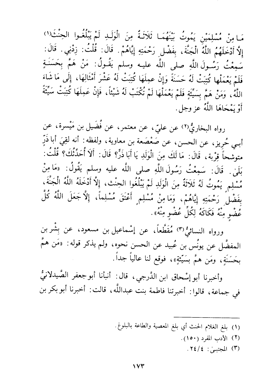 مامن مُسْلِمَيْنِ يَمُوتُ بَيْنَهُمَا ثَلاثَةٌ مِنَ الْوَلَدِ لَمْ يَبْلُغُوا الْحِنْثَ (1) إِلا أَدْخَلَهُمُ اللَّهُ الْجَنَّةَ، بِفَضْلِ رَحْمَتِهِ إِيَّاهُمْ. قال: قُلْتُ: زِدْنِي. قال: سمعت رَسُول اللَّهِ صَلَّى اللَّهُ عَلَيْهِ وسَلَّمَ يَقُولُ: مَنْ هَمَّ بِحَسَنَةٍ فَلَمْ يَعْمَلْهَا كُتِبَتْ لَهُ حَسَنَةً وإِنْ عَمِلَهَا كُتِبَتْ لَهُ عشر أمثالثا، إِلَى مَا شَاءَ اللَّهُ، ومَنْ هَمَّ بِسَيِّئَةٍ فَلَمْ يَعْمَلْهَا لَمْ تُكْتَبْ لَهُ شَيْئًا، فَإِنْ عَمِلَهَا كُتِبَتْ سَيِّئَةً أَوْ يَمْحَاهَا اللَّهُ عزوجل.