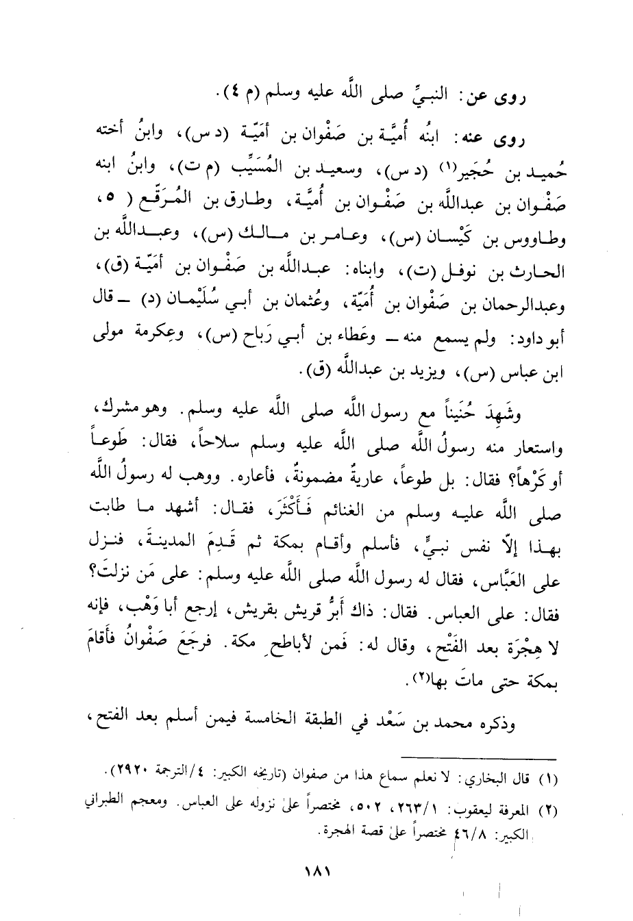 وشهد حنينا مع رسول الله صَلَّى اللَّهُ عَلَيْهِ وسَلَّمَ. وهو مشرك، واستعار منه رسول الله صَلَّى اللَّهُ عليه وسلم سلاحا، فقال: طوعا أو كرها؟ فقال: بل طوعا، عارية مضمونة، فأعاره. ووهب لَهُ رَسُول اللَّهِ صَلَّى اللَّهُ عَلَيْهِ وسَلَّمَ من الغنائم فأكثر، فقال: أشهد ما طابت بهذا إلا نفس نبي، فأسلم وأقام بمكة ثم قدم المدينة، فنزل على العباس، فقال له رسول اللَّهِ صلى الله عليه وسلم: على من نزلت؟ فقال: على العباس. فقال: ذاك أبر قريش بقريش، ارجع أبا وهب، فإنه لا هجرة بعد الفتح، وَقَال له: فمن لأباطح مكة. فرجع صفوان فأقام بمكة حتى مات بها (2) .