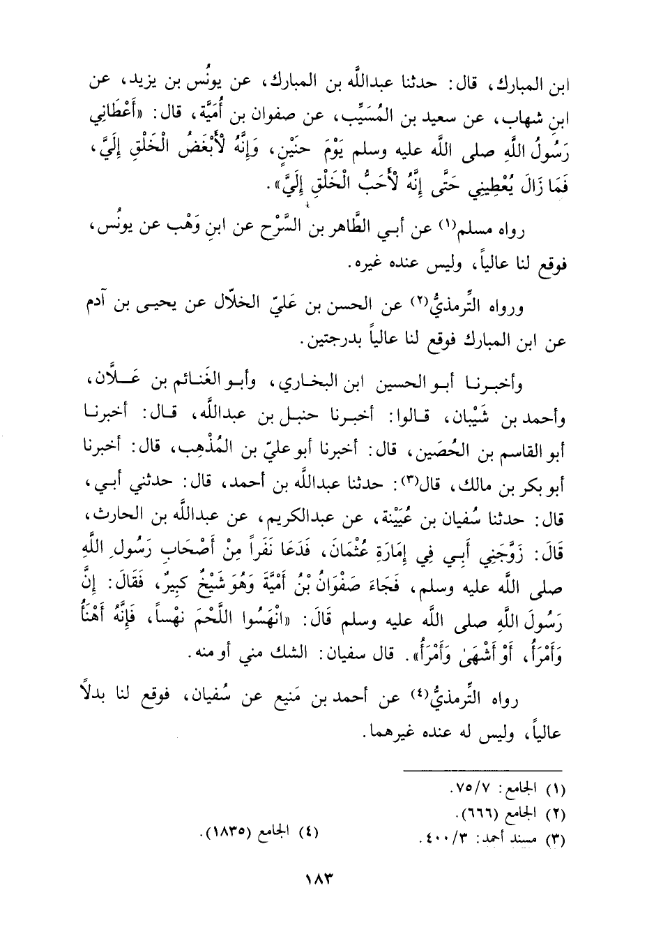 ابن الْمُبَارَكِ، قال: حَدَّثَنَا عَبد اللَّهِ بْن المبارك، عَنْ يونس بْن يَزِيدَ، عَنِ ابْنِ شِهَابٍ، عَنْ سَعِيد بْنِ المُسَيَّب، عَنْ صَفْوَانَ بْنِ أُمَيَّةَ، قال: أَعْطَانِي رَسُولُ اللَّهِ صلى الله عليه وسلم يَوْمَ حُنَيْنٍ، وإِنَّهُ لأَبْغَضُ الْخَلْقِ إِلَيَّ، فَمَا زَالَ يُعْطِينِي حَتَّى إِنَّهُ لأَحَبُّ الْخَلْقِ إِلَيَّ.
