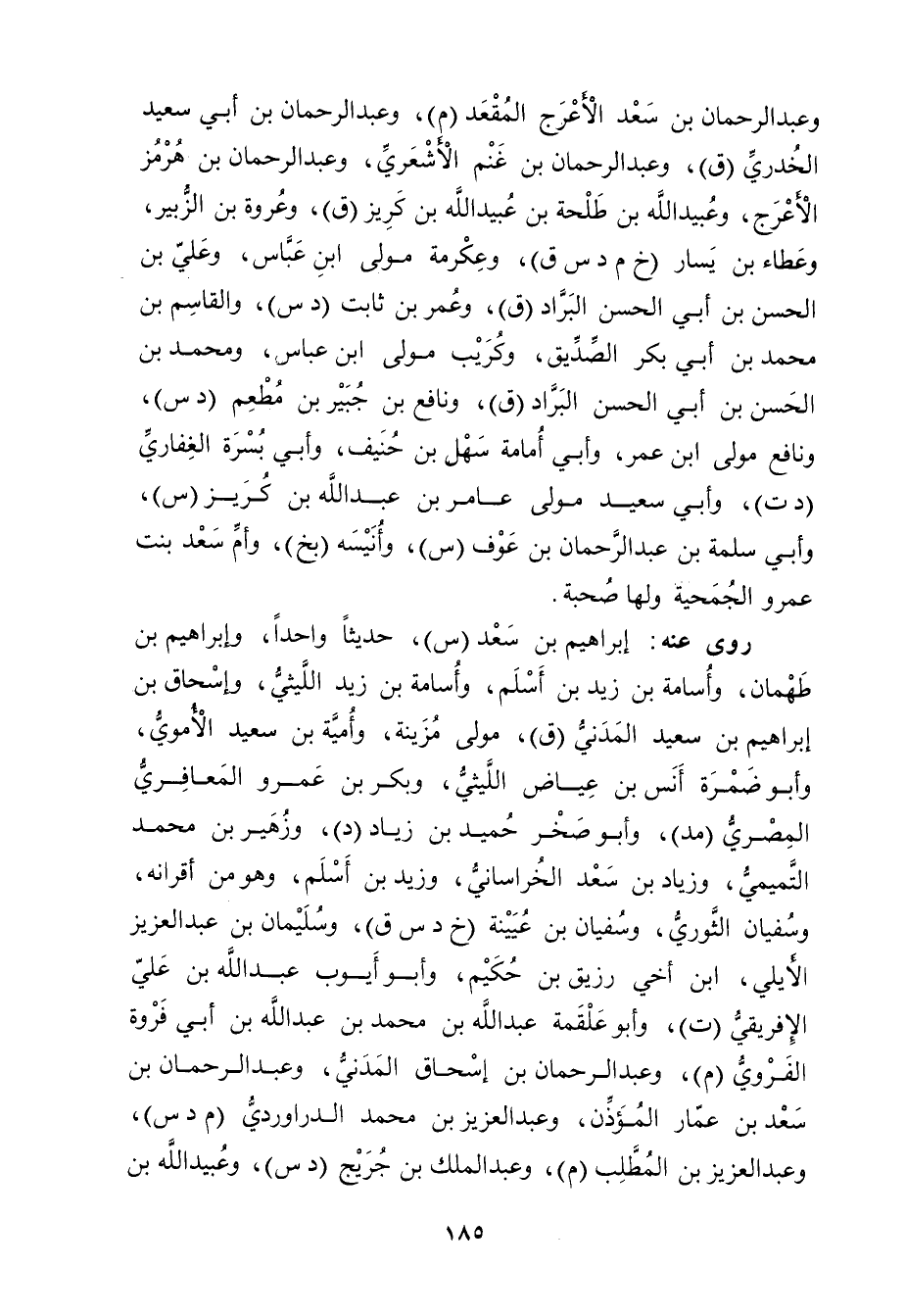 وعبد الرحمن بْن سعد الأعرج المقعد (م) ، وعبد الرحمن بْن أَبي سَعِيد الخُدْرِيّ (ق) ، وعبد الرحمن بْن غنم الأشعري، وعبد الرحمن بن هرمز الأعرج، وعُبَيد الله بن طلحة بْن عُبَيد الله بْن كريز (ق) ، وعروة بْن الزبير، وعطاء بْن يسار (خ م د س ق) ، وعكرمة مولى ابْن عباس، وعلي بن الحسن بن أَبي الحسن البراد (ق) ، وعُمَر بن ثابت (د س) ، والقاسم بْن مُحَمَّد بْن أَبي بكر الصديق، وكريب مولى ابن عباس، ومحمد بْن الْحَسَن بْن أَبي الحسن البراد (ق) ، ونافع بن جبير بْن مطعم (د س) ، ونافع مولى ابْن عُمَر، وأبي أمامة سهل بن حنيف، وأبي بسرة الغفاري (د ت) ، وأبي سَعِيد مولى عامر بن عَبد الله بن كريز (س) ، وأبي سلمة بْن عَبْد الرحمن بْن عوف (س) ، وأنيسه (بخ) ، وأم سعد بنت عَمْرو الجمحية ولها صحبة.