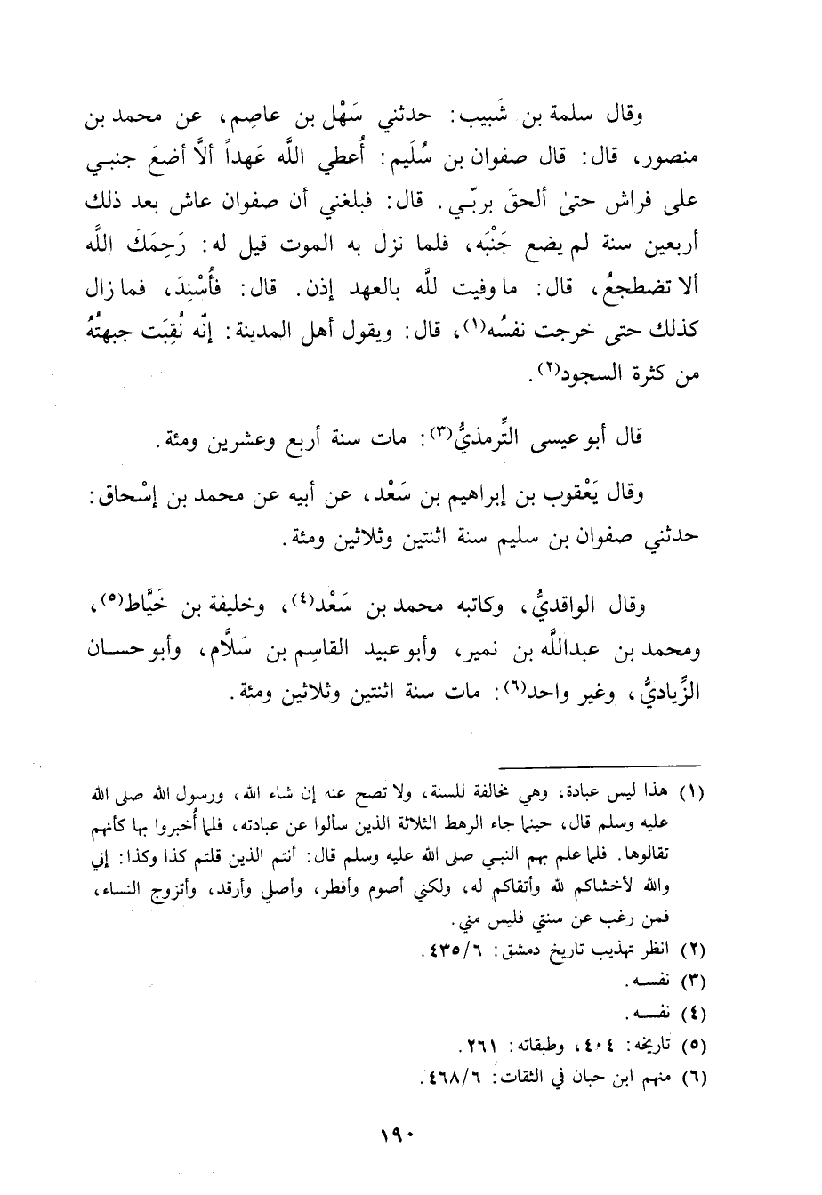 وَقَال سلمة بن شبيب: حدثني سهل بن عاصم، عن محمد بن منصور، قال: قال صفوان بن سليم: أعطي الله عهدا ألا أضع جنبي على فراش حتى ألحق بربي. قال: فبلغني أن صفوان عاش بعد ذلك أربعين سنة لم يضع جنبه، فلما نزل به الموت قيل له: رحمك الله ألا تضطجع، قال: ما وفيت لله بالعهد إذن. قال: فأسند، فمازال كذلك حتى خرجت نفسه (1) ، قال: ويقول أهل المدينة: إنه نقبت جبهته من كثرة السجود (2) .