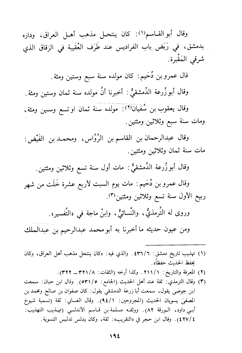 وَقَال أبو القاسم (1) : كان ينتحل مذهب أهل العراق، وداره بدمشق، في ربض باب الفراديس عند طرف العقيبة في الزقاق الذي شرقي المقبرة.