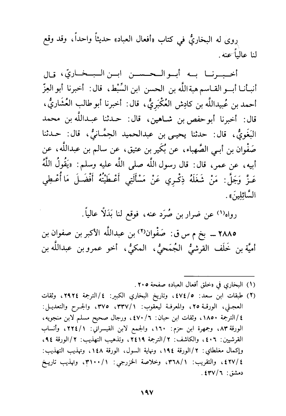 أَخْبَرَنَا بِهِ أَبُو الْحَسَنِ بْنُ الْبُخَارِيِّ، قال أَنْبَأَنَا أَبُو الْقَاسِمِ هِبَةُ اللَّهِ بْنُ الْحَسَنِ بْنِ السِّبْطِ، قال: أَخْبَرَنَا أَبُو الْعِزِّ أَحْمَدُ بْنُ عُبَيد اللَّهِ بْنِ كَادِشٍ الْعُكْبَرِيُّ، قال: أَخْبَرَنَا أَبُو طَالِبٍ الْعُشَارِيُّ، قال: أَخْبَرَنَا أَبُو حَفْصِ بْنُ شَاهِينَ، قال: حَدَّثَنَا عَبد الله بْن مُحَمَّد البغوي، قال: حَدَّثَنَا يحيى بن عبد الحميد الْحِمَّانِيُّ، قال: حَدَّثَنَا صَفْوَانُ بْنُ أَبي الصَّهْبَاءِ، عَنْ بُكَيْرِ بْنِ عَتِيقٍ، عَنْ سَالِمِ بْنِ عَبد اللَّهِ، عَن أَبِيهِ عَنْ عُمَر، قال: قال رَسُولُ اللَّهِ صلى اللَّهُ عَلَيْهِ وسَلَّمَ: يَقُولُ اللَّهُ عزوجل: مَنْ شَغَلَهُ ذِكْرِي عَنْ مَسْأَلَتِي أَعْطَيْتُهُ أَفْضَلَ مَا أُعْطِي السَّائِلِينَ.