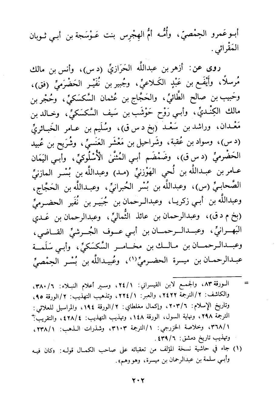 = الورقة 83، والجمع لابن القيسراني: 1 / 24، وسير أعلام النبلاء 6 / 380، والكاشف: 2 / الترجمة 2422، والعبر: 1 / 224، وتذهيب التهذيب: 2 / الورقة 95، وتاريخ الاسلام: 6 / 203، وإكمال مغلطاي: 2 / الورقة 194، والمراسيل للعلائي: الترجمة 298، ونهاية السول، الورقة 148، وتهذيب التهذيب: 4 / 428، والتقريب: 1 / 368، وخلاصة الخزرجي: 1 / الترجمة 3103، وشذرات الذهب: 1 / 238، وتهذيب تاريخ دمشق: 6 / 439.