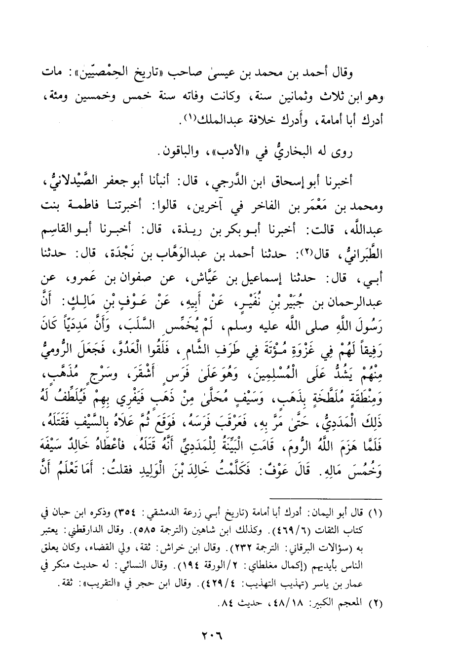 أَخْبَرَنَا أَبُو إِسْحَاقَ ابْنُ الدَّرَجِيِّ، قال: أَنْبَأَنَا أَبُو جَعْفَرٍ الصَّيْدَلانِيُّ، ومُحَمَّدُ بْنُ مَعْمَرِ بْنِ الْفَاخِرِ فِي آخِرِينَ، قَالُوا: أَخْبَرَتْنا فَاطِمَةُ بِنْتُ عَبد اللَّهِ، قَالَتْ: أخبرنا أَبُو بَكْرِ بْنِ رِيذَةَ، قال: أخبرنا أَبُو الْقَاسِمِ الطَّبَرَانِيُّ، قال (2) : حَدَّثَنَا أَحْمَدُ بْن عبد الوهاب بْن نجدة، قال: حَدَّثَنَا أَبِي، قال: حَدَّثَنَا إِسْمَاعِيلَ بْنِ عياش، عن صفوان بْنِ عَمْرو، عَنْ عَبْدِ الرَّحْمَنِ بْن جبير بْن نفير، عَن أَبِيهِ، عَنْ عَوْفِ بْنِ مَالِكٍ: أن رَسُول اللَّهِ صَلَّى اللَّهُ عَلَيْهِ وسَلَّمَ، لَمْ يُخَمِّسِ السَّلَبَ، وأَنَّ مَدَدِيًّا كَانَ رَفِيقًا لَهُمْ فِي غَزْوَةِ مُؤْتَةَ فِي طَرَفِ الشَّامِ، فَلَقُوا الْعَدُوَّ، فَجَعَلَ الرُّومِيُّ مِنْهُمْ يَشُدُّ عَلَى الْمُسْلِمِينَ، وهُوَ عَلَى فَرَسٍ أَشْقَرَ، وسَرْجٍ مُذَهَّبٍ، ومِنْطَقَةٍ مُلَطَّخَةٍ بِذَهَبٍ، وسَيْفٍ مُحَلَّى مِنْ ذَهَبٍ فَيَفْرِي بِهِمْ فَيُلَطِّفُ لَهُ ذَلِكَ الْمَدَدِيُّ، حَتَّى مَرَّ بِهِ، فَعَرْقَبَ فَرَسَهُ، فَوَقَعَ ثُمَّ عَلاهُ بِالسَّيْفِ فَقَتَلَهُ، فَلَمَّا هَزَمَ اللَّهُ الرُّومَ، قَامَتِ الْبَيِّنَةُ لِلْمَدَدِيِّ أَنَّهُ قَتَلَهُ، فَأَعْطَاهُ خَالِدٌ سَيْفَهُ وخُمُسَ مَالِهِ. قال عَوْفٌ: فَكَلَّمْتُ خَالِدَ بْنَ الْوَلِيدِ فَقُلْتُ: أَمَا تعلم أن