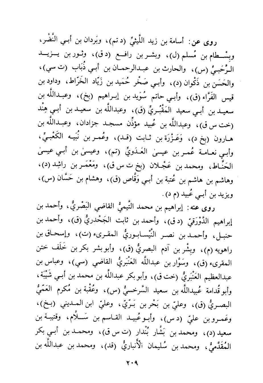 رَوَى عَن: أسامة بْن زيد الليثي (د تم) ، وبردان بن أَبي النضر، وبسطام بن مسلم (ل) ، وبشر بن رافع (د ق) ، وثور بْن يَزِيدَ الرحبي (س) ، والحارث بْن عبد الرحمن بن أَبي ذباب (ت سي) ، والحسن بن ذكوان (د) ، وأبي صخر حميد بْن زياد الخراط، وداود بن قيس الفراء (ق) ، وأبي حاتم سويد بن إبراهيم (بخ) ، وعبد الله بن سَعِيد بن أَبي سَعِيد المقبري (ق) ، وعبد الله بْن سَعِيد بْن أَبي هند (خت س ق) ، وعبد الله بن عُبَيد مؤذن مسجد جزادان، وعبد الله بن هارون (بخ د) ، وعزرة بن ثابت (قد) ، وعُمَر بن نبيه الكعبي، وأبي نعامة عُمَر بن عيسى العدوي (تم) ، وعيسى بن أَبي عيسى الحناط، ومحمد بن عجلان (بخ ت س ق) ، ومَعْمَر بن راشِد (د) ، وهاشم بْن هاشم بْن عتبة بْن أَبي وقاص (ق) ، وهشام بن حسان (س) ، ويزيد بن أَبي عُبَيد (م د) .