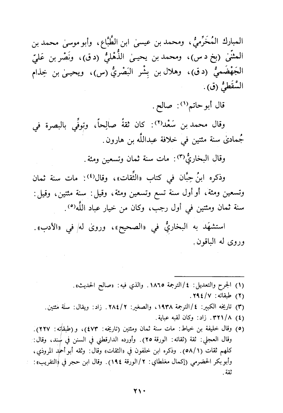(3) تاريخه الكبير: 4 / الترجمة 1938، والصغير: 2 / 284. زاد: ويُقال: سنة مئتين.