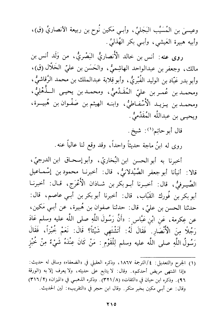 أَخْبَرَنَا بِهِ أَبُو الْحَسَنِ بْنُ الْبُخَارِيِّ، وأَبُو إِسْحَاقَ ابن الدَّرَجِيِّ، قَالا: أَنْبَأَنَا أَبُو جَعْفَرٍ الصَّيْدَلانِيُّ، قال: أَخْبَرَنَا مَحْمُودُ بْنُ إِسْمَاعِيلَ الصَّيْرَفِيُّ، قال: أخبرنا أَبُو بَكْرِ بْنُ شَاذَانَ الأَعْرَجُ، قال: أَخْبَرَنَا أَبُو بَكْرِ بْنُ فُورَكٍ الْقَبَّابُ، قال: أَخْبَرَنَا أَبُو بَكْرِ بْنُ أَبي عَاصِمٍ، قال: حَدَّثَنَا الْحَسَنُ بْنُ علي، قال: حَدَّثَنَا صَفْوَانُ بْنُ هُبَيْرَةَ، عَن أَبِي مَكِينٍ، عَنْ عِكْرِمَةَ، عَنِ ابْنِ عَبَّاسٍ: أَنَّ رَسُولَ اللَّهِ صَلَّى اللَّهُ عَلَيْهِ وسَلَّمَ عَادَ رَجُلا مِنَ الأَنْصَارِ. فَقَالَ لَهُ: أَتَشْتَهْيِ شَيْئًا؟ قال: نَعَمْ خُبْزًا، فَقَالَ رَسُول اللَّهِ صلى الله عليه وسَلَّمَ لِلْقَوْمِ: مَنْ كَانَ عِنْدَهُ شيء من خبز
