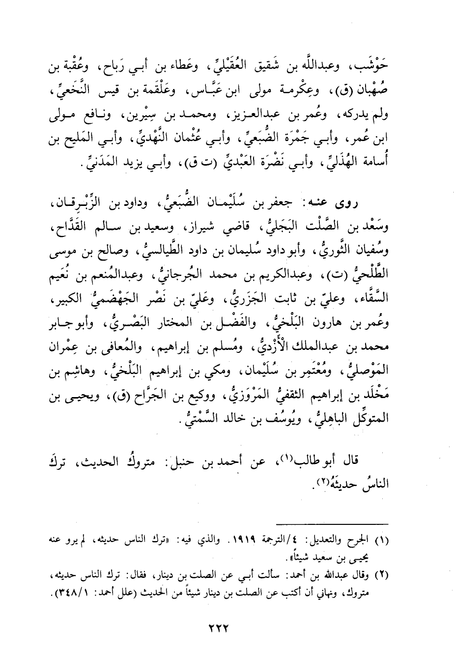 (1) الجرح والتعديل: 4 / الترجمة 1919. والذي فيه: ترك الناس حديثه، لم يرو عنه يحيى بْن سَعِيد شيئا.