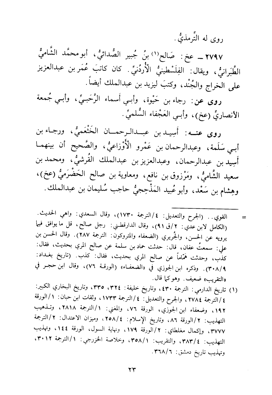 2797 - عخ: صالح بن جبير الصدائي (1) ، أبو محمد الشامي الطبراني، ويُقال: الفلسطيني الأردني. كَانَ كاتب عُمَر بْن عبد العزيز على الخراج والجند، وكتب ليزيد بن عَبد المَلِك أيضا.