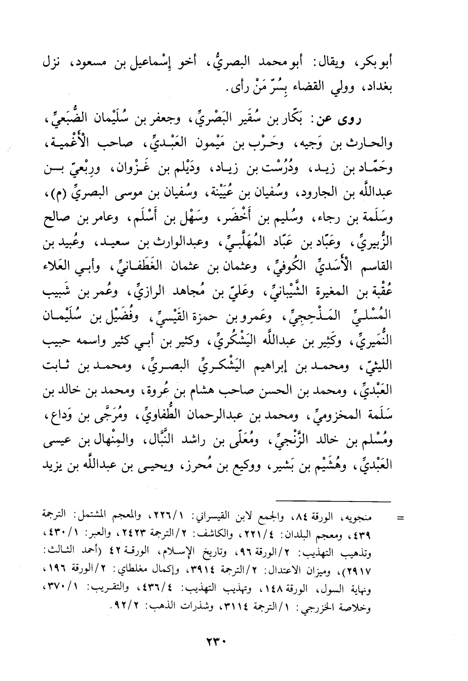 = منجويه، الورقة 84، والجمع لابن القيسراني: 1 / 226، والمعجم المشتمل: الترجمة 439، ومعجم البلدان: 4 / 221، والكاشف: 2 / الترجمة 2423، والعبر: 1 / 430، وتذهيب التهذيب: 2 / الورقة 96، وتاريخ الاسلام، الورقة 42 (أحمد الثالث: 2917) ، وميزان الاعتدال: 2 / الترجمة 3914، وإكمال مغلطاي: 2 / الورقة 196، ونهاية السول، الورقة 148، وتهذيب التهذيب: 4 / 436، والتقريب: 1 / 370، وخلاصة الخزرجي: 1 / الترجمة 3114، وشذرات الذهب: 2 / 92.