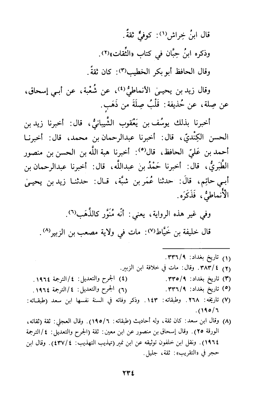 (8) وَقَال ابن سعد: كان ثقة، وله أحاديث (طبقاته: 6 / 195) . وَقَال العجلي: ثقة (ثقاته، الورقة 25) . وَقَال إسحاق بْن منصور عَن ابن مَعِين: ثقة (الجرح والتعديل: 4 / الترجمة 1964) . ونقل ابن خلفون توثيقه عن ابن نمير (تهذيب التهذيب: 4 / 437) . وَقَال ابن