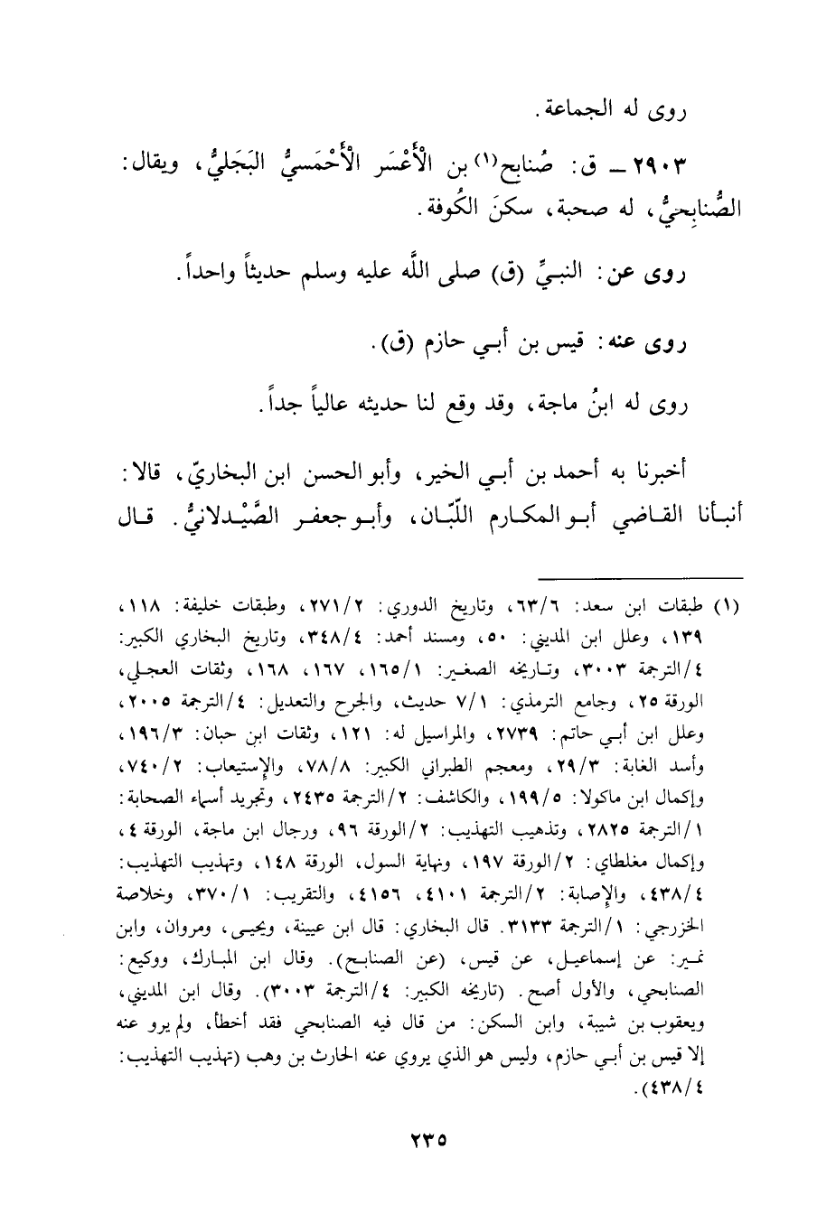 2903 - ق: صنابح بن الأعسر الأحمسي البجلي (1) ، ويُقال: الصنابحي، لهُ صُحبَةٌ، سكن الكوفة.