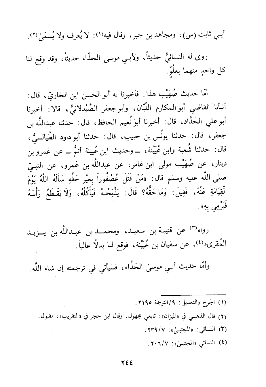 أَمَّا حَدِيثُ صُهَيْبٍ هَذَا: فَأَخْبَرَنَا بِهِ أَبُو الْحَسَنِ بْنُ الْبُخَارِيِّ، قال: أَنْبَأَنَا الْقَاضِي أَبُو الْمَكَارِمِ اللَّبَّانُ، وأَبُو جَعْفَرٍ الصيدلاني، قالا: أخبرنا أَبُو عَلِيّ الحداد، قال: أَخْبَرَنَا أبو نعيم الحافظ، قال: حَدَّثَنَا عَبد الله بْنُ جَعْفَرٍ، قال: حَدَّثَنَا يُونُسُ بْنُ حَبِيبٍ، قال: حَدَّثَنَا أَبُو دَاوُدُ الطَّيَالِسِيُّ، قال: حَدَّثَنَا شُعْبَةُ وابْنُ عُيَيْنَة، وحَدِيثُ ابْنِ عُيَيْنَة أَتَمُّ، عَن عَمْرو بْنِ دِينَارٍ، عَنْ صُهَيْبٍ مولى ابْن عَامِرٍ، عَنْ عَبد اللَّهِ بْن عَمْرو، عَنِ النَّبِيِّ صلى الله عليه وسَلَّمَ قال: مَنْ قَتَلَ عُصْفُورًا بِغَيْرِ حَقِّهِ سَأَلَهُ اللَّهُ يَوْمَ الْقِيَامَةِ عَنْهُ، فَقِيلَ: ومَا حَقَّهُ؟ قال: يَذْبَحُهُ فَيَأْكُلُهُ، ولا يَقْطَعُ رَأْسَهُ فَيَرْمِي بِهِ.