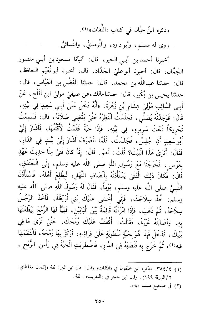 أَخْبَرَنَا أَحْمَدُ بْن أَبي الخير، قال: أَنْبَأَنَا مسعود بْن أَبي منصور الجمال، قال: أَخْبَرَنَا أَبُو عَلِيّ الحداد، قال: أَخْبَرَنَا أَبُو نُعَيْمٍ الْحَافِظُ، قال: حَدَّثَنَا عَبد اللَّهِ بْن مُحَمَّدٍ، قال: حَدَّثَنَا الْفَضْلُ بْنُ الْعَبَّاسِ، قال: حَدَّثَنَا يَحْيَى بْنُ بُكَيْرٍ، قال: حَدَّثَنَا مَالِكٌ، عَنْ صيفي مولى ابن أَفْلَحَ، عَن أَبِي السَّائِبِ مَوْلَى هِشَامِ بْنِ زُهْرَةَ: أَنَّهُ دَخَلَ عَلَى أَبِي سَعِيد فِي بَيْتِهِ، قال فَوَجَدْتُهُ يُصَلِّي، فَجَلَسْتُ أْنَتْظَرُهُ حَتَّى يَقْضِيَ صَلاتَهُ، قال: فَسَمِعْتُ تَحْرِيكًا تَحْتَ سَرِيرِهِ، فِي بَيْتِهِ، فَإِذَا حَيَّةٌ فَقُمْتُ لأَقْتُلَهَا، فَأَشَارَ إِلَيَّ أَبُو سَعِيد أَنِ اجْلِسْ، فَجَلَسْتُ، فَلَمَّا انْصَرَفَ أَشَارَ إِلَى بَيْتٍ فِي الدَّارِ، فَقَالَ: أَتَرَى هَذَا الْبَيْتَ؟ قُلْتُ: نَعَمْ. قال: إِنَّهُ كَانَ فَتًى مِنَّا حَدِيثَ عَهْدٍ بِعُرْسٍ، فَخَرَجْنَا مَعَ رَسُولِ اللَّهِ صلى الله عليه وسلم، إِلَى الْخَنْدَقِ، قال: فَكَانَ ذَلِكَ الْفَتَى يَسْتَأْذِنُهُ بِأَنْصَافِ النَّهَارِ، لِيَطَّلِعَ أَهْلَهُ، فَاسْتَأَذْنَ النَّبِيَّ صَلَّى اللَّهُ عَلَيْهِ وسَلَّمَ، يَوْمًا، فَقَالَ لَهُ رَسُول اللَّهِ صلى الله عليه وسَلَّمَ: خُذْ سِلاحَكَ، فَإِنِّي أَخْشَى عَلَيْكَ بَنِي قُرَيْظَةَ، فَأَخَذَ الرَّجُلُ سِلاحَهُ، ثُمَّ ذَهَبَ، فَإِذَا امْرَأَتُهُ قَائِمَةٌ بَيْنَ الْبَابَيْنِ، فَهَيَّأَ لَهَا الرُّمْحَ لِيَطْعَنَهَا بِهِ، وأَصَابَتْهُ غَيْرَةٌ، فَقَالَتْ: اكْفُفْ عَلَيْكَ رُمْحَكَ، حَتَّى تَرَى مَا فِي بَيْتِكَ، فَدَخَلَ فَإِذَا هُوَ بِحَيَّةٍ مُنْطَوِيَةٍ عَلَى فِرَاشِهِ، فَرَكَّزَ بِهَا رُمْحَهُ، فَانْتَظَمَهَا فِيهِ (2) ، ثُمَّ خَرَجَ بِهِ فنَصَبَهُ فِي الدَّارِ، فَاضْطَرَبَتِ الْحَيَّةُ فِي رأس الرمح،