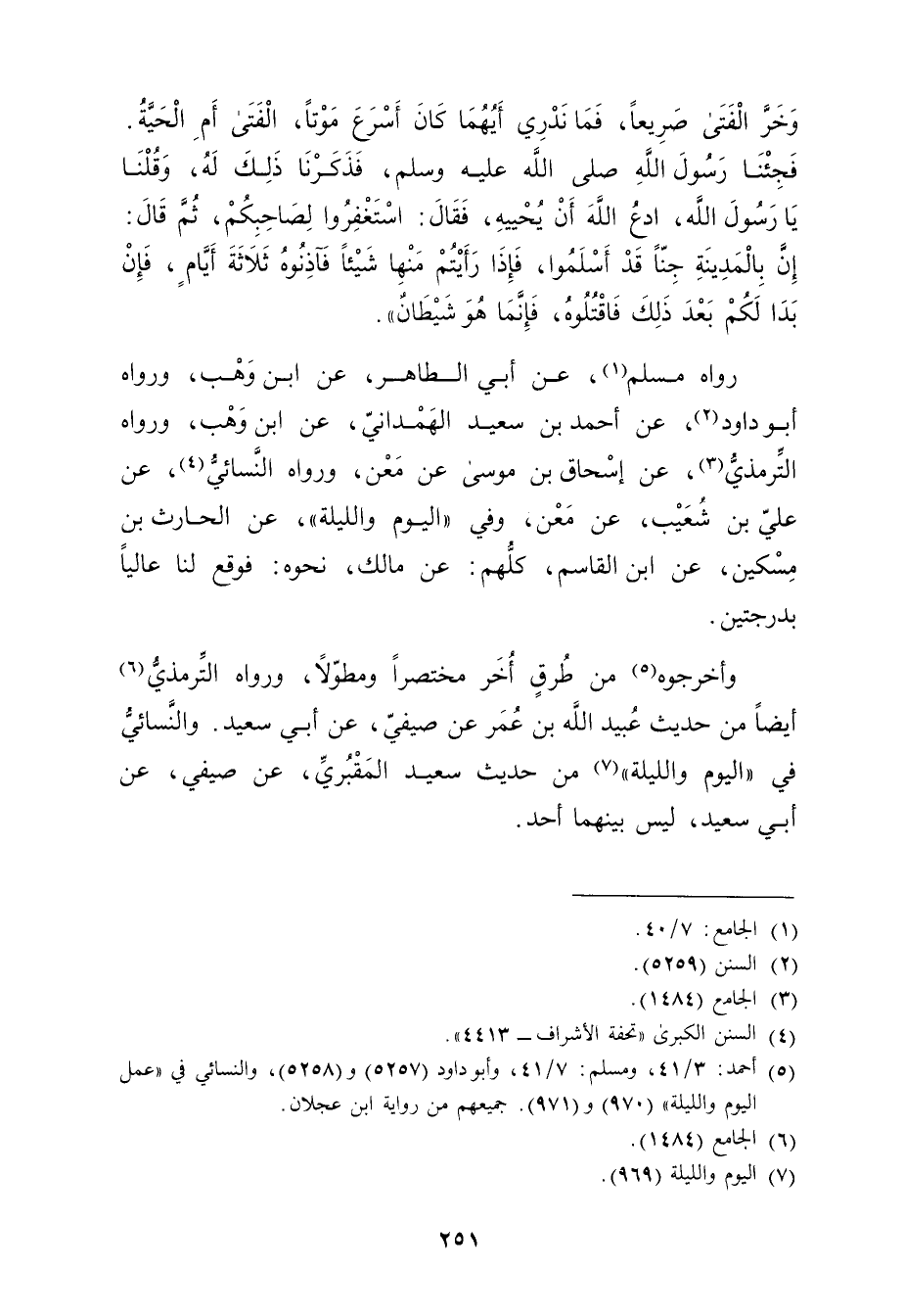 وأَخْرَجُوهُ (5) مِنْ طُرُقٍ أُخَرَ مُخْتَصَرًا ومُطَوَّلا، ورواه التِّرْمِذِيّ (6) أيضا من حدى عُبَيد اللَّهِ بْنِ عُمَر عن صَيْفِيٍّ، عَن أَبِي سَعِيد. والنَّسَائي في "اليوم والليلة" (7) من حديث سَعِيد الْمَقْبُرِيِّ، عَنْ صَيْفِيٍّ، عَن أَبِي سَعِيد، لَيْسَ بَيْنَهُمَا أَحَدٌ.