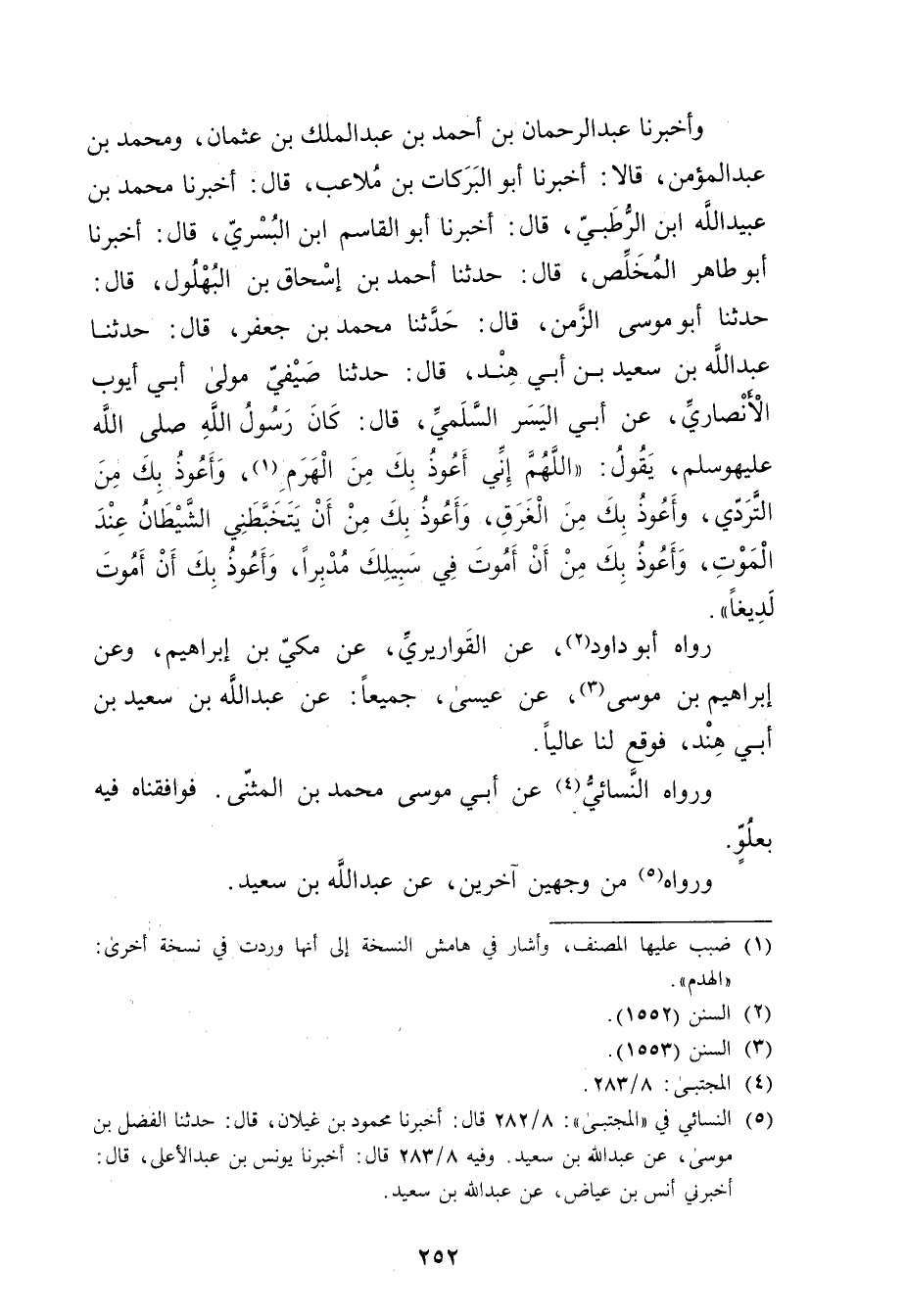 وأَخْبَرَنَا عَبْدُ الرَّحْمَنِ بْنُ أَحْمَدَ بْنِ عَبد المَلِك بْنِ عُثْمَانَ، ومحمد بن عبد المؤمن، قَالا: أخبرنا أَبُو الْبَرَكَاتِ بْنُ مُلاعِبٍ، قال: أَخْبَرَنَا مُحَمَّدُ بْنُ عُبَيد اللَّهِ بْنِ الرُّطَبِيِّ، قال: أخبرنا أبو القاسم ابن الْبُسْرِيِّ، قال: أَخْبَرَنَا أَبُو طَاهِرٍ المخلص، قال: حَدَّثَنَا أَحْمَد بْن إِسْحَاقَ بْنِ الْبَهْلُولِ، قال: حَدَّثَنَا أَبُو مُوسَى الزَّمَنُ، قال: حَدَّثَنَا مُحَمَّدُ بْنُ جَعْفَرٍ، قال: حَدَّثَنَا عَبد الله بْن سَعِيد بْن أَبي هِنْدٍ، قال: حَدَّثَنَا صَيْفِيٌّ مَوْلَى أَبِي أَيُّوبَ الأَنْصارِيّ، عَن أَبِي الْيُسْرِ السُّلَمِيِّ، قال: كَانَ رَسُول اللَّهِ صلى الله عليه وسَلَّمَ، يَقُولُ: اللَّهُمَّ إِنِّي أَعُوذُ بِكَ مِنَ الْهَرَمِ (1) ، وأَعُوذُ بِكَ مِنَ التَّرَدِّي، وأَعُوذُ بِكَ مِنَ الْغَرَقِ، وأَعُوذُ بِكَ مِنْ أَنْ يَتَخَبَّطَنِي الشَّيْطَانُ عِنْدَ الْمَوْتِ، وأَعُوذُ بِكَ مِنْ أَنْ أَمُوتَ فِي سَبِيلِكَ مُدْبِرًا، وأَعُوذُ بِكَ أَنْ أَمُوتَ لَدِيغًا.