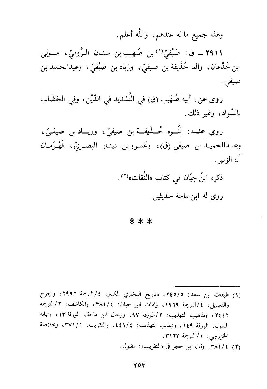 2911 - ق: صيفي بن صهيب بن سنان الرومي (1) ، مولى ابن جدعان، والد حذيفة بن صيفي، وزياد بن صيفي، وعبد الحميد بن صيفي.