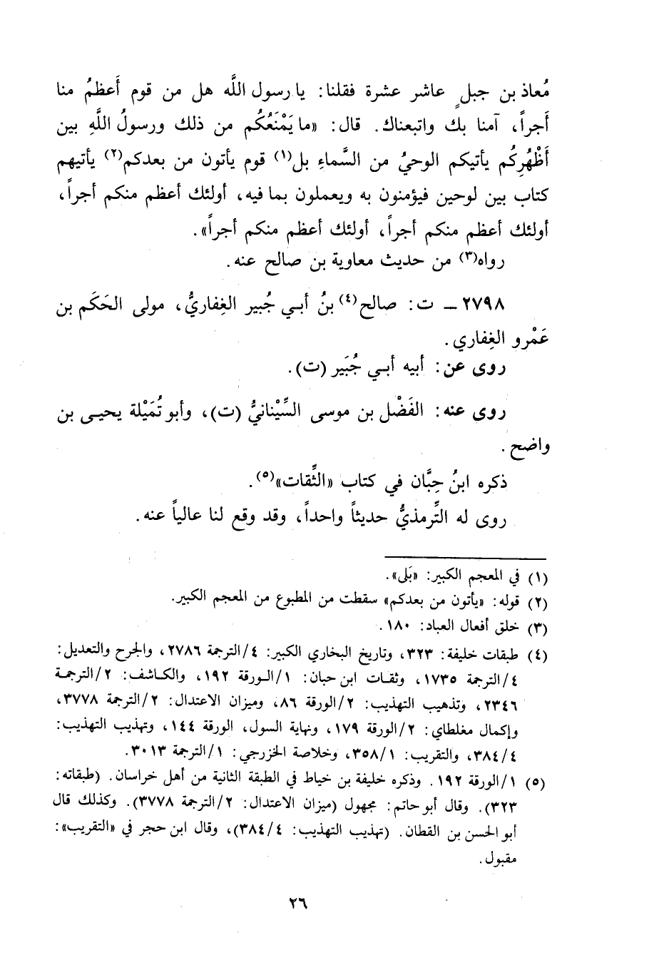 مُعَاذُ بْنُ جَبَلٍ عَاشِرَ عَشَرَةَ فَقُلْنَا: يَا رَسُولَ اللَّهِ هَلْ مِنْ قَوْمٍ أَعْظَمُ مِنَّا أَجْرًا، آمَنَّا بِكَ واتَّبَعْنَاكَ. قال: مَا يَمْنَعُكُمْ مِنْ ذَلِكَ ورَسُولُ اللَّهِ بَيْنَ أَظْهُرِكُمْ يَأْتِيكُمُ الْوَحْيُ مِنَ السَّمَاءِ بَلْ (1) قَوْمٌ يَأْتُونَ مِنْ بَعْدِكُمْ (2) يَأْتِيهِمْ كِتَابٌ بَيْنَ لَوْحَيْنِ فيؤمنون به ويعلمون بِمَا فِيهِ، أُولَئِكَ أَعْظَمُ مِنْكُمْ أَجْرًا، أُولَئِكَ أَعْظَمُ مِنْكُمْ أَجْرًا، أُولَئِكَ أَعْظَمُ مِنْكُمْ أَجْرًا.