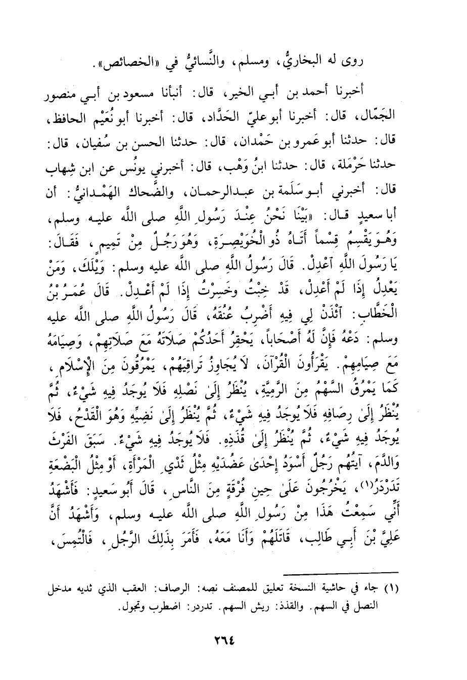 أَخْبَرَنَا أَحْمَدُ بْنُ أَبي الْخَيْرِ، قال: أَنْبَأَنَا مَسْعُودُ بْن أَبي منصور الجمال، قال: أَخْبَرَنَا أَبُو عَلِيّ الحداد، قال: أَخْبَرَنَا أبو نعيم الحافظ، قال: حَدَّثَنَا أَبُو عَمْرو بْنُ حَمْدَانَ، قال: حَدَّثَنَا الْحَسَنُ بْنُ سُفْيَانَ، قال: حَدَّثَنَا حَرْمَلَةُ، قال: حَدَّثَنَا ابْنُ وهْبٍ، قال: أَخْبَرَنِي يُونُسَ عن ابْن شهاب قال: أخبرني أبو سملة بْنُ عَبْدِ الرَّحْمَنِ، والضَّحَّاكُ الْهَمْدَانِيُّ: أَنَّ أَبَا سَعِيد قال: بَيْنَا نَحْنُ عِنْدَ رَسُولِ اللَّهِ صَلَّى اللَّهُ عَلَيْهِ وسَلَّمَ، وهُوَ يَقْسِمُ قَسْمًا أَتَاهُ ذُو الْخُوَيْصِرَةِ، وهُوَ رَجُلٌ مِنْ تَمِيمٍ، فَقَالَ: يَا رَسُولَ اللَّهِ اعْدِلْ. قال رَسُولُ اللَّهِ صلى الله عليه وسلم: ويْلَكَ، ومَنْ يَعْدِلُ إِذَا لَمْ أَعْدِلْ، قَدْ خِبْتُ وخَسِرْتُ إِذَا لَمْ أَعْدِلْ. قال عُمَر بْنُ الْخَطَّابِ: ائْذَنْ لِي فِيهِ أَضْرِبُ عُنُقَهُ، قال رَسُولُ اللَّهِ صَلَّى اللَّهُ عَلَيْهِ وسَلَّمَ: دَعْهُ فَإِنَّ لَهُ أَصْحَابًا، يَحْقِرُ أَحَدُكُمْ صَلاتَهُ مَعَ صَلاتِهِمْ، وصِيَامَهُ مَعَ صِيَامِهِمْ. يَقْرَأُونَ الْقُرْآنَ، لا يُجَاوِزُ تَرَاقِيَهُمْ، يَمْرُقُونَ مِنَ الإِسْلامِ، كَمَا يَمْرُقُ السَّهْمُ مِنَ الرَّمِيَّةِ، يُنْظَرُ إِلَى نَصْلِهِ فَلا يُوجَدُ فِيهِ شَيْءٍ، ثُمَّ يُنْظَرُ إِلَى رَصَافِهِ فَلا يُوجَدُ فِيهِ شَيْءٍ، ثُمَّ يُنْظَرُ إِلَى نَضِيِّهِ وهُوَ الْقَدَحُ، فَلا يُوجَدُ فِيهِ شَيْءٍ، ثُمَّ يُنْظَرُ إِلَى قُذَذِهِ. فَلا يُوجَدُ فِيهِ شئ.
