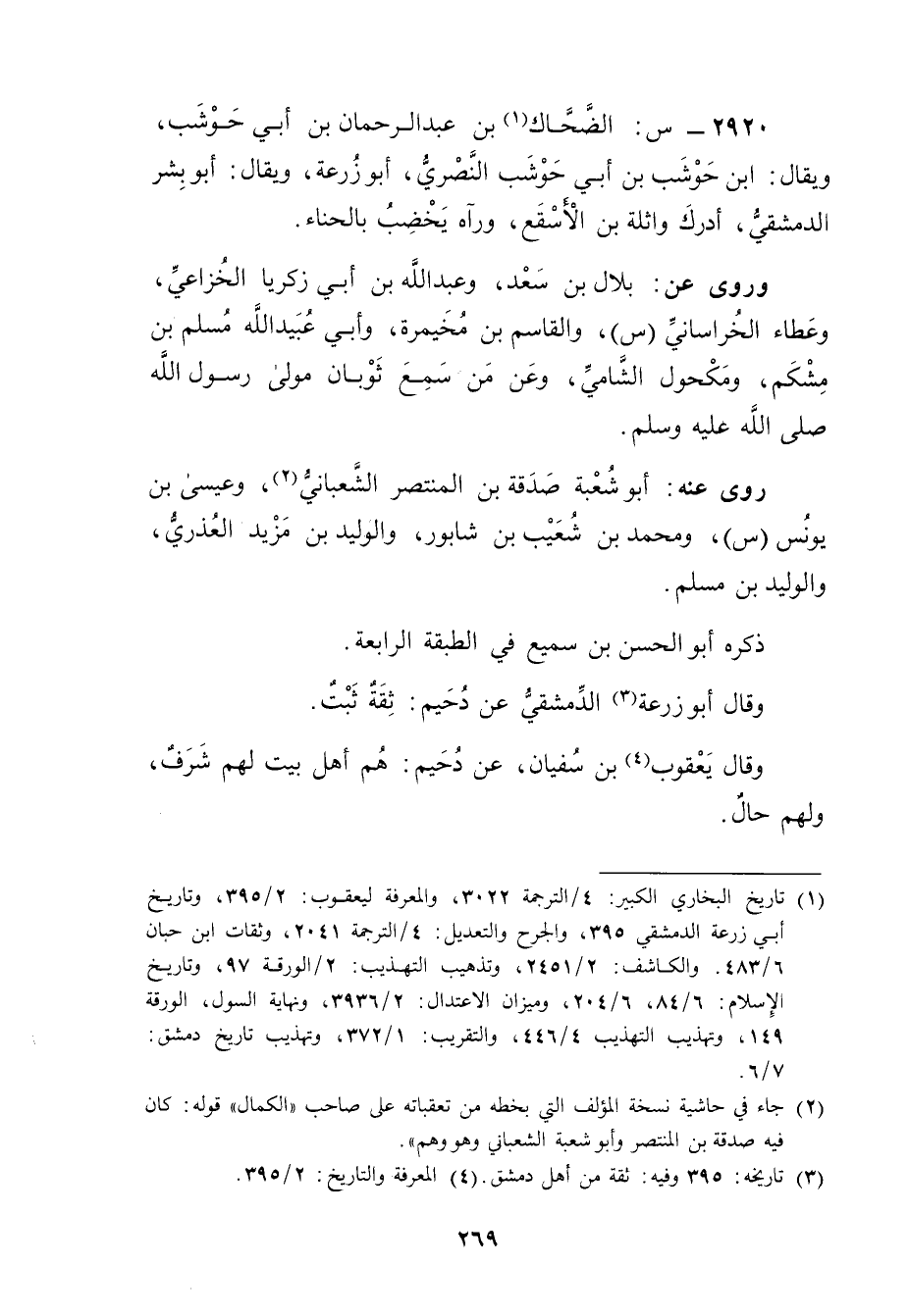 2920 - س: الضحاك بن عبد الرحمن بن أَبي حوشب (1) ، ويُقال: ابن حوشب بن أَبي حوشب النصري، أبو زُرْعَة، ويُقال: أبو بشر الدمشقي، أدرك واثلة بن الأسقع، ورآه يخضب بالحناء.