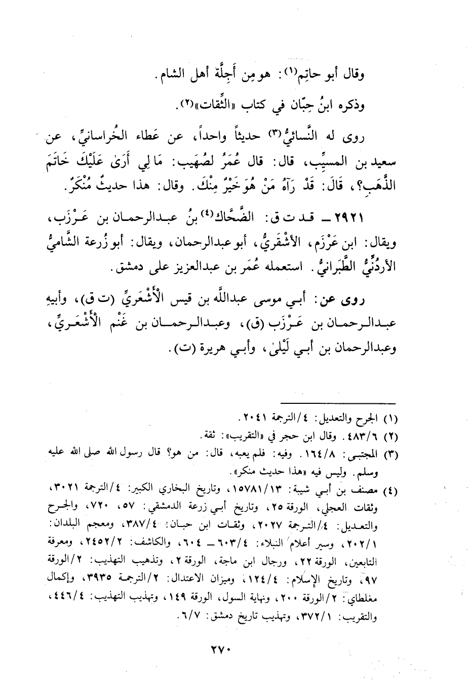 2921 - قد ت ق: الضحاك بْن عبد الرحمن بْن عرزب (4) ، ويُقال: ابن عرزم، الأشقري، أبو عَبْد الرحمن، ويُقال: أبو زُرْعَة الشامي الأردني الطبراني. استعمله عُمَر بْن عبد العزيز على دمشق.