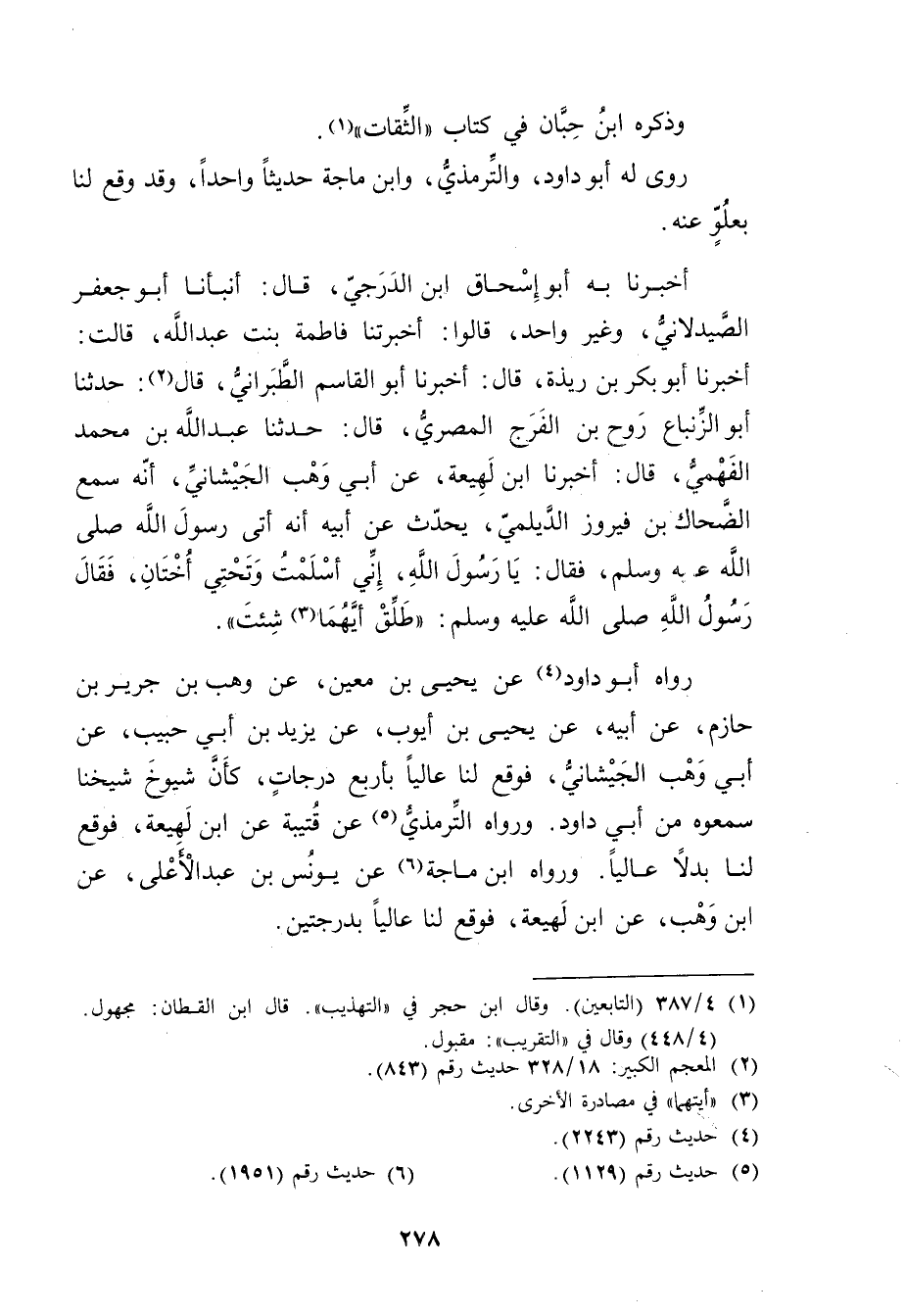 أَخْبَرَنَا بِهِ أَبُو إِسْحَاقَ ابْنُ الدَّرَجِيِّ، قال: أَنْبَأَنَا أَبُو جَعْفَرٍ الصَّيْدَلانِيُّ، وغَيْرُ واحِدٍ، قَالُوا: أَخْبَرَتْنا فَاطِمَةُ بِنْتُ عَبد اللَّهِ، قَالَتْ: أخبرنا أَبُو بَكْرِ بْنُ رِيذَةَ، قال: أخبرنا أَبُو الْقَاسِمِ الطبراني، قال (2) : حَدَّثَنَا أبوالزنباع رَوْحُ بْنُ الْفَرَجِ المِصْرِي، قال: حَدَّثَنَا عَبد اللَّهِ بْن مُحَمَّد الْفَهْمِيُّ، قال: أَخْبَرَنَا ابْنُ لَهِيعَة، عَن أَبِي وهْبٍ الْجَيْشَانِيِّ، أَنَّهُ سَمِعَ الضَّحَّاكَ بْنَ فَيْرُوزَ الدَّيْلَمِيَّ، يُحَدِّثُ عَن أَبِيهِ أَنَّهُ أَتَى رَسُول اللَّهِ صلى الله عليه وسَلَّمَ، فقَالَ: يا رَسُول اللَّهِ، إِنِّي أَسْلَمْتُ وتَحْتِي أُخْتَانِ، فَقَالَ رَسُول اللَّهِ صلى الله عليه وسَلَّمَ: طَلِّقْ أَيُّهُمَا (3) شِئْتَ.