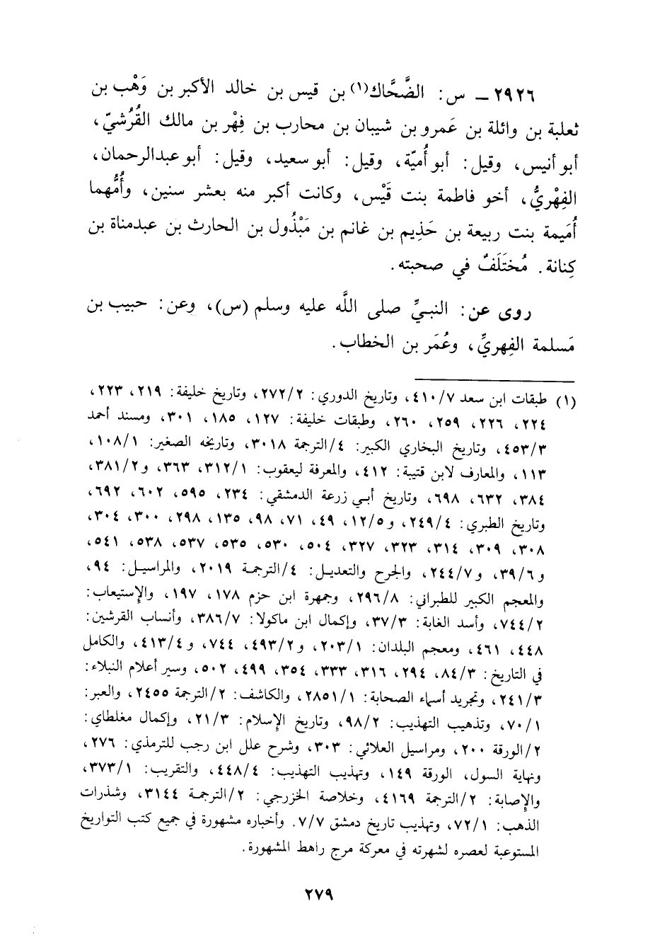 (1) طبقات ابن سعد 7 / 410، وتاريخ الدوري: 2 / 272، وتاريخ خليفة: 219، 223، 224، 226، 259، 260، وطبقات خليفة: 127، 185، 301، ومسند أحمد 3 / 453، وتاريخ البخاري الكبير: 4 / الترجمة 3018، وتاريخه الصغير: 1 / 108، 113، والمعارف لابن قتيبة: 412، والمعرفة ليعقوب: 1 / 312، 363، و2 / 381، 384، 632، 689، وتاريخ أبي زرعة الدمشقي: 234، 595، 602، 692، وتاريخ الطبري: 4 / 249، و5 / 12، 49، 71، 98، 135، 298، 300، 304، 308، 309، 314، 323، 327، 504، 530، 535، 537، 538، 541، و6 / 39، و7 / 244، والجرح والتعديل: 4 / الترجمة 2019، والمراسيل: 94، والمعجم الكبير للطبراني: 8 / 296، وجمهرة ابن حزم 178، 197، والاستيعاب: 2 / 744، وأسد الغابة: 3 / 37، وإكمال ابن ماكولا: 7 / 386، وأنساب القرشين: 448، 461، ومعجم البلدان: 1 / 203، و2 / 493، 744، و4 / 413، والكامل في التاريخ: 3 / 84، 294، 316، 333، 354، 499، 502، وسير أعلام النبلاء: 3 / 241، وتجريد أسماء الصحابة: 1 / 2851، والكاشف: 2 / الترجمة 2455، والعبر: 1 / 70، وتذهيب التهذيب: 2 / 98، وتاريخ الاسلام: 3 / 21، وإكمال مغلطاي: 2 / الورقة 200، ومراسيل العلائي: 303، وشرح علل ابن رجب للترمذي: 276، ونهاية السول، الورقة 149، وتهذيب التهذيب: 4 / 448، والتقريب: 1 / 373، والاصابه: 2 / الترجمة 4169، وخلاصة الخزرجي: 2 / الترجمة 3144، وشذرات الذهب: 1 / 72، وتهذيب تاريخ دمشق 7 / 7.